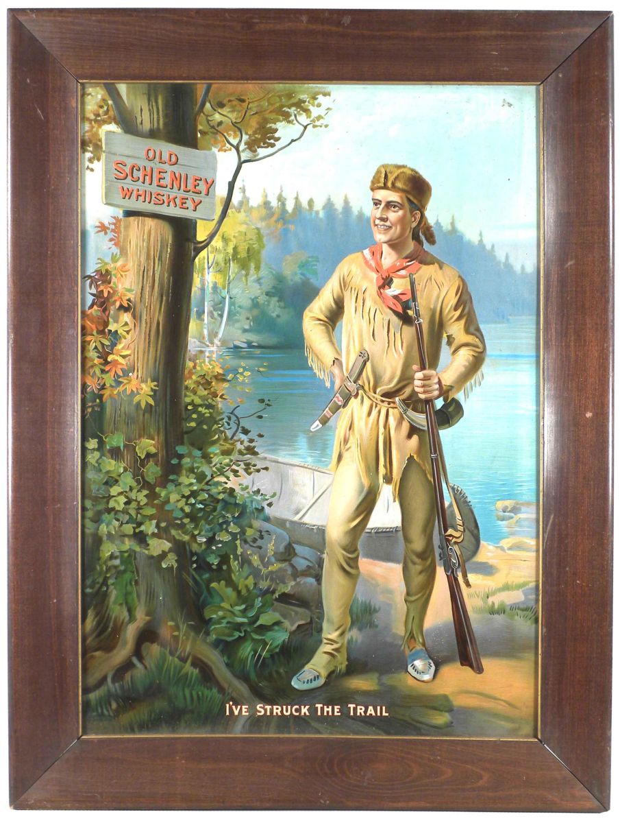 Old Schenley Whiskey Tin Sign, in original frame. Entitled, "I've Struck the Trail". The best one we have ever seen. A couple of tiny rust spots otherwise excellent condition. 25 X 33 inches overall.
