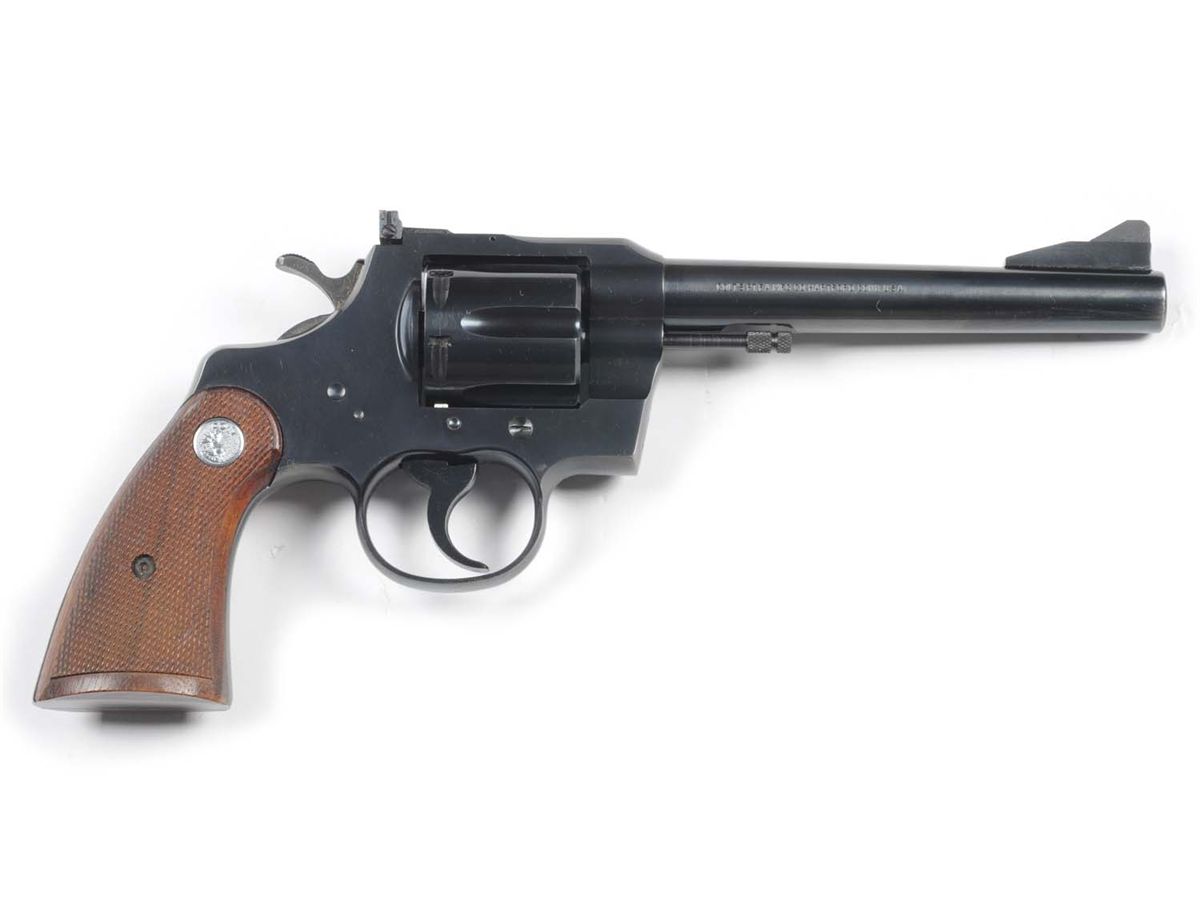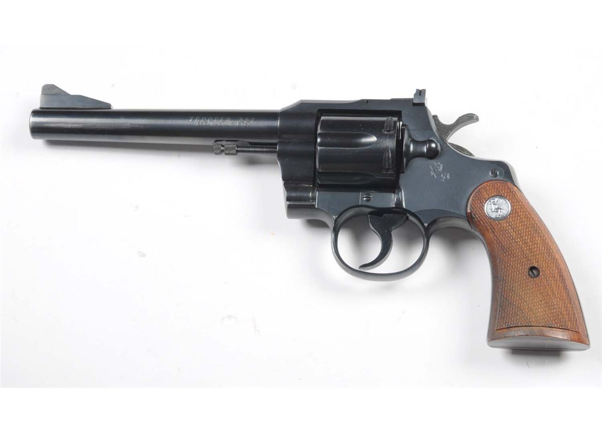 Serial # 39860 This revolver was manufactured in 1964. It resembles the old style Colt Officers Model Match more closely than it does the Trooper Mark III. Features include a 6" barrel, blued finish, target sights, small silver medallion checkered walnut grips, and double action. Gun remains in near new condition with just a hint of muzzle wear and a light drag line keeping it from brand new. Mint bore and action.