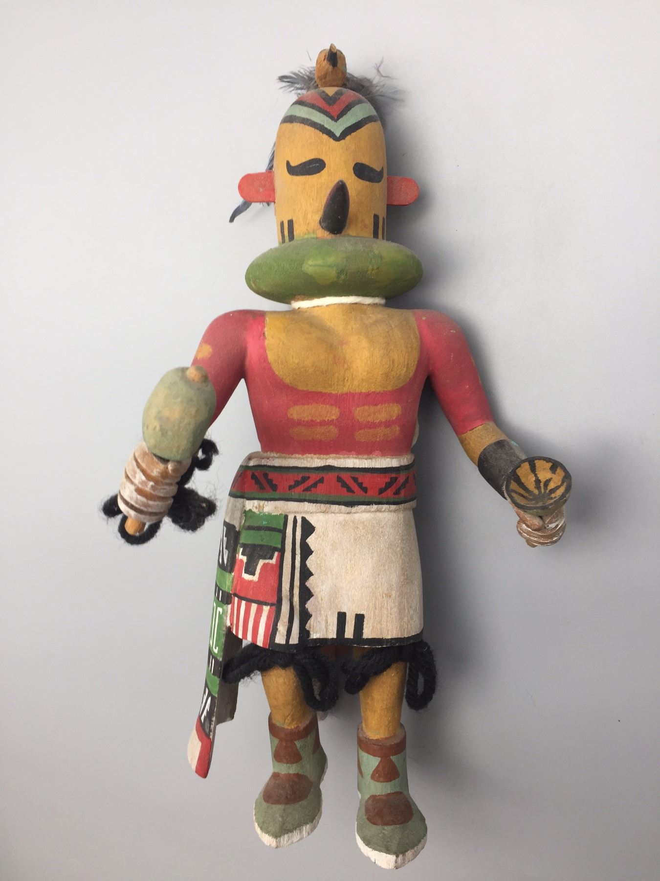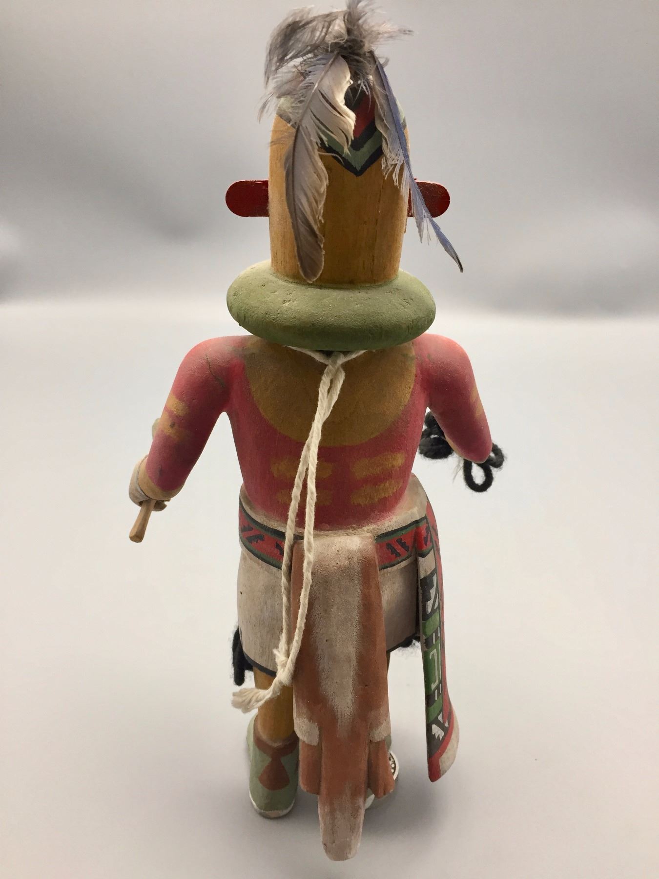 Maker: Unknown Hopi artist. Approx. Age: Vintage, circa 1970s. Size: 10 1/2” tall x 5 1/4” w. Additional Info: An older style, hanging, Hopi Kachina. Condition: Pretty good for its age, normal wear and fading expected. Feathers on top probably are not all there. Please look closely at the pictures - they are an important part of our description. Shipping: There will be a $7 handling / packaging fee for shipping this lot. The actual cost of postage will be added on top of that.