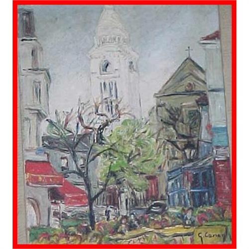 This 10-3/4" tall by 8-3/4" long oil painting on canvas painting is of a cityscape with a steeple in the background. This heavy brushstoke(pallet knife) painting looks-like maybe New England area or maybe somewhere in Europe. The painting comes with a frame that measures 14-1/2" by 12-1/2"; probably not original frame(Found Together in a Attic; but does not fix exact). Good condition with a sliver paint loss(Approx. 1/2" long). I would guess the age around 1930's(maybe earlier)by the style and material used in the painting. A Nice Impressionistic painting with heavy brushstrokes by a talented artist.