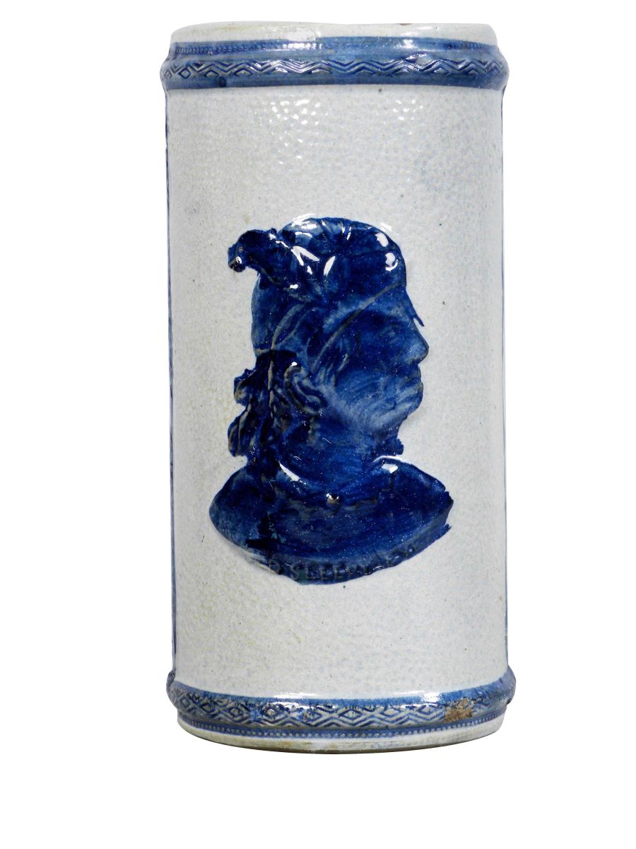 Old Sleepy Eye Vase, grey and blue. The letter "W" stamped in bottom. Two small chips in bottom rim otherwise excellent condition. 8 1/2 inches tall.