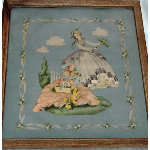 Large oak framed print of two Southern Bells, Ladies. The print is signed Averill. The images are within a floral ribbon border. The condition is OK. There appears to be some moister damage and the paper is wrinkled a bit. I have not had it out of the glass so there is a chance that the darkening I see is only dirt on the inside of the glass. Or it could be the of the paper darkening from moisture. It color variation is very slight and only noticeable upon very close inspection. The whole piece is 17 1/4" x 15 1/4". The frame looks in ok condition. It could use some finish as currently it looks rather rustic.