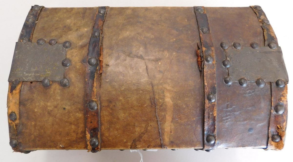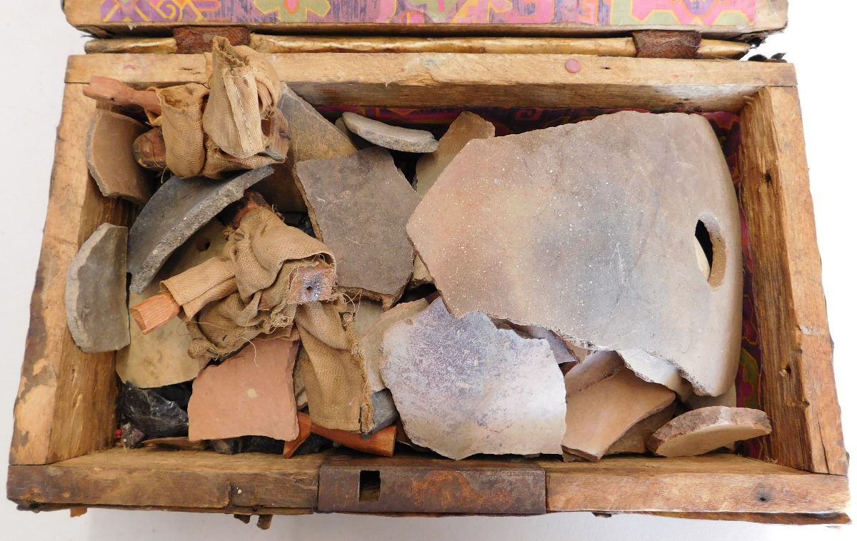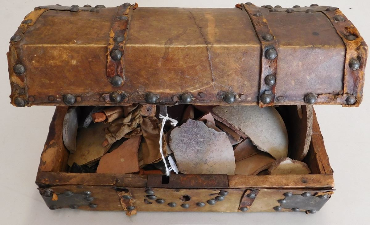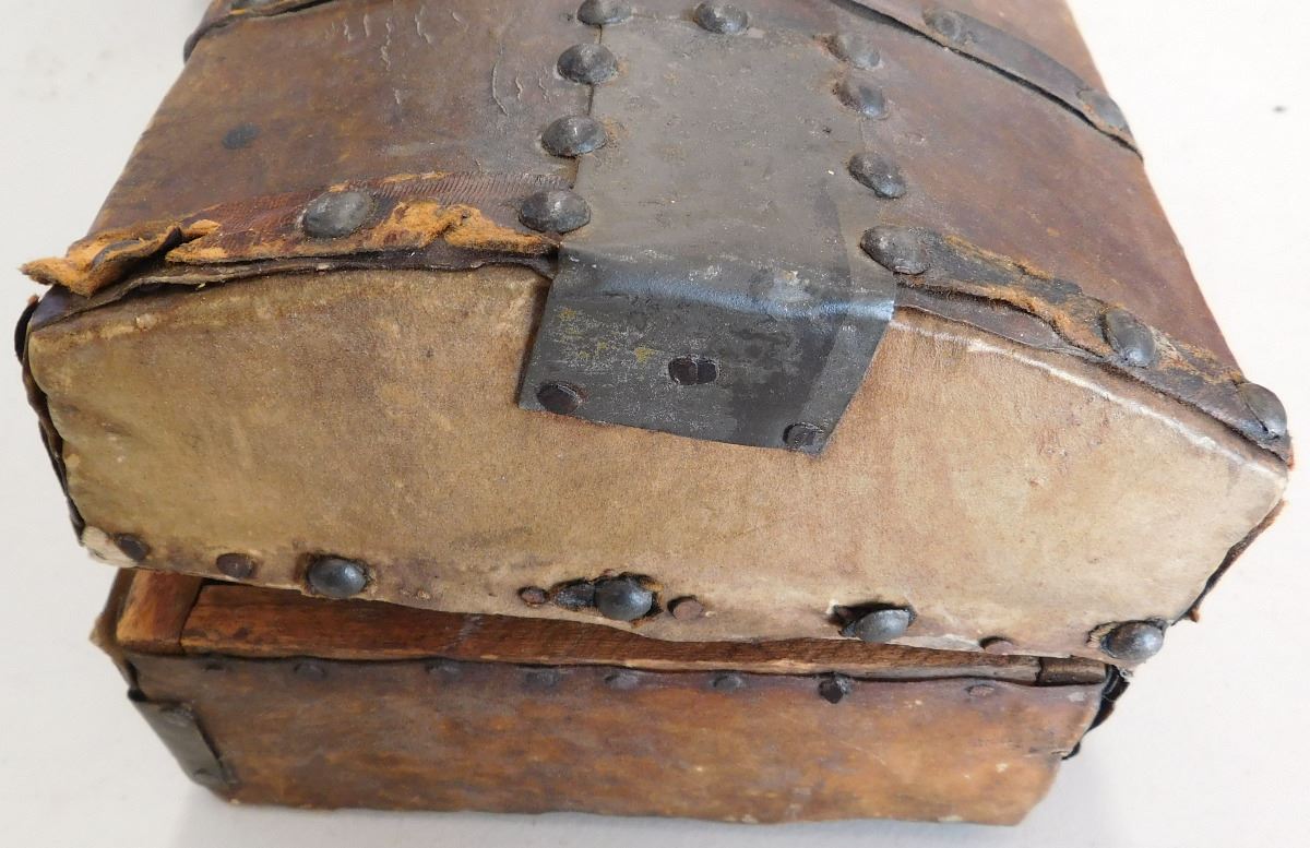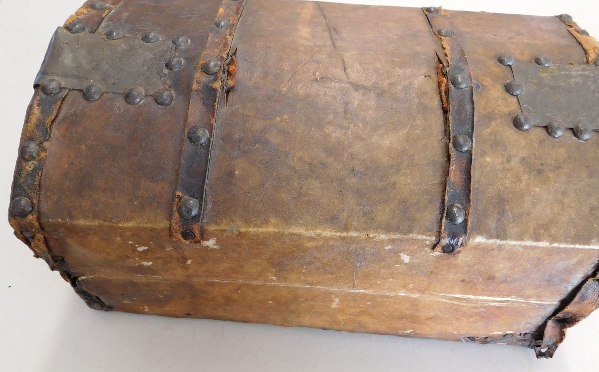 Old Spanish Trunk of Indian Relics, c. 1790s-1820s. Made of leather covered wood, steel nails, brass tacks, the box measures 12" x 7.5" x 5.5". Old Spanish Colonial. This was probably a child's trunk. Condition: Lock doesn’t work, overall well-worn, see images. Shipping: $27.50.