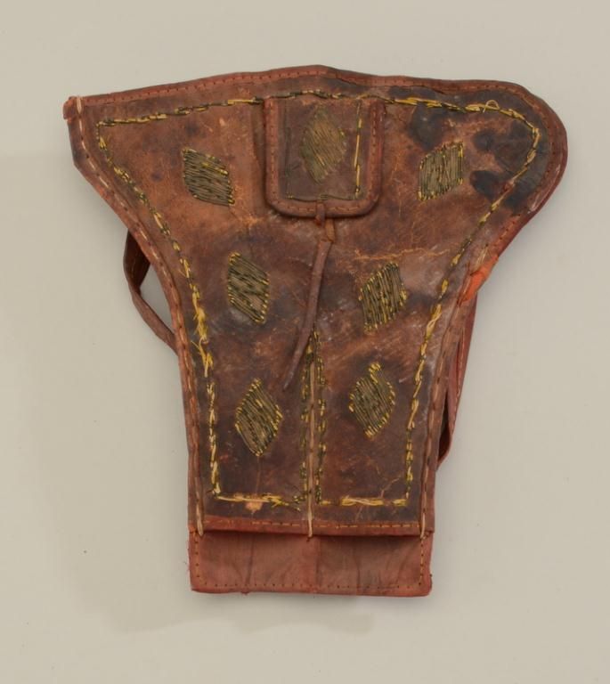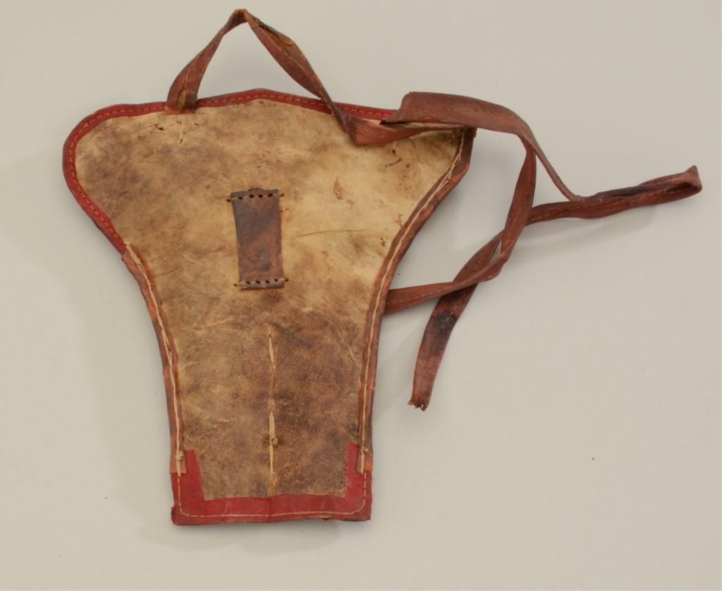Old Spanish style leather double holster for single shot percussion pistols with decorative weavings on the front in overall fair + condition; shoulder strap is in two pieces but still attached to the body of theholster; from an old collection. Est.: $150-$300.