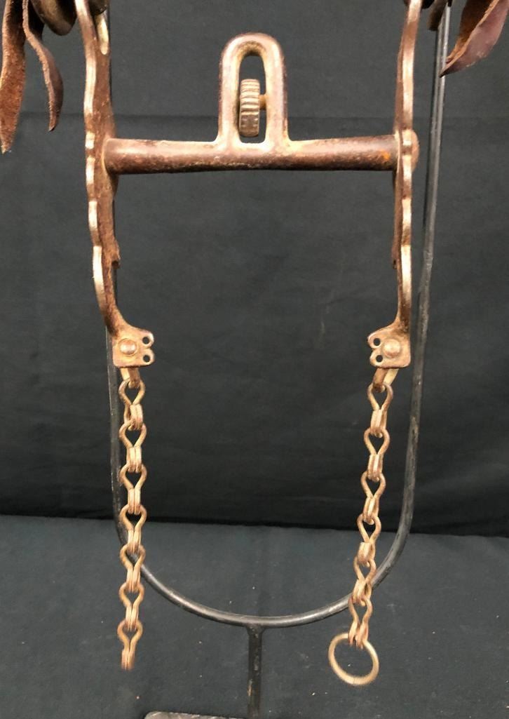 Up for consideration in this lot is an old spotted leather cowboy bridle with Buermann Bird bit. The bridle features metal dots and conchos in the design. Maker: Buermann. Approx. Age: Early 1900s. Size: Bit: mouth 4-3/4 inches wide. Overall is 6 inches long. Headstall is standard horse. Condition: Fair for its age, wear expected. Please look closely at the pictures - they are an important part of our description. Shipping: There will be a $10 handling / packaging fee for shipping this lot. The actual cost of postage will be added on top of that. BUY IT NOW: If you would like to buy this item now without waiting for the auction to end (this option is only available up to 48 hours before the auction starts to close), the “Buy it Now” price is the high estimate of this lot. If you would like to end the auction early and pay the high estimate (plus applicable fees), please contact us by phone or email and reference this lot number.