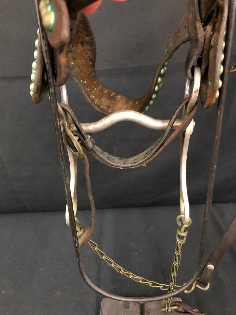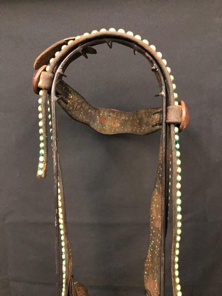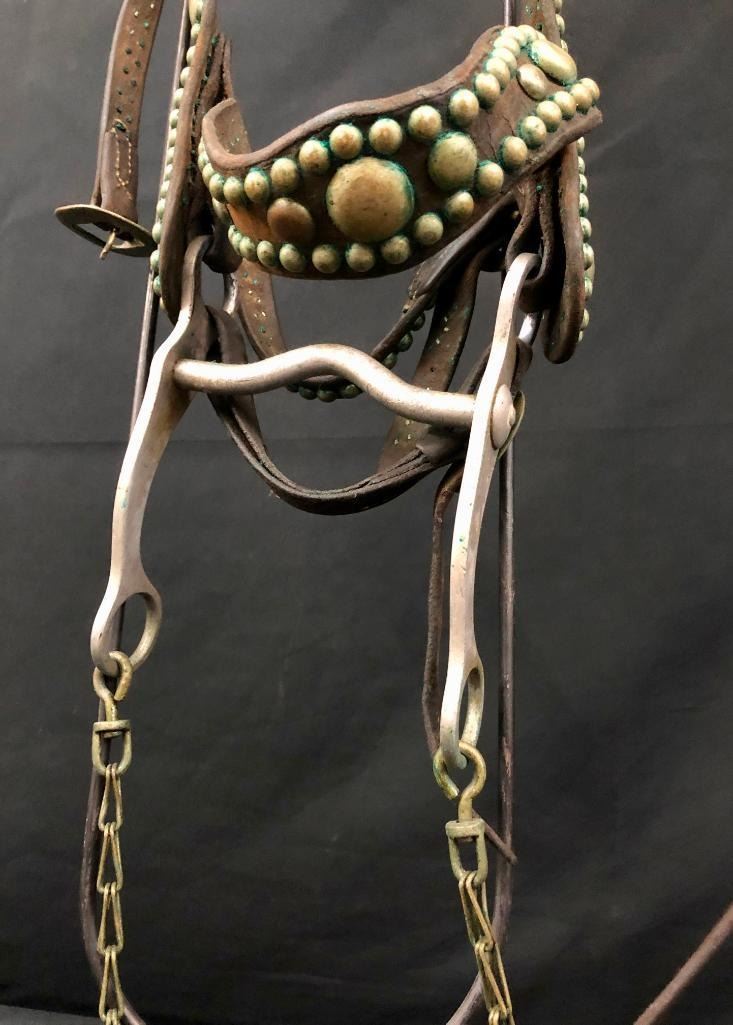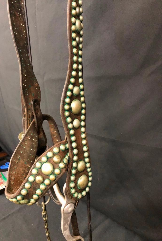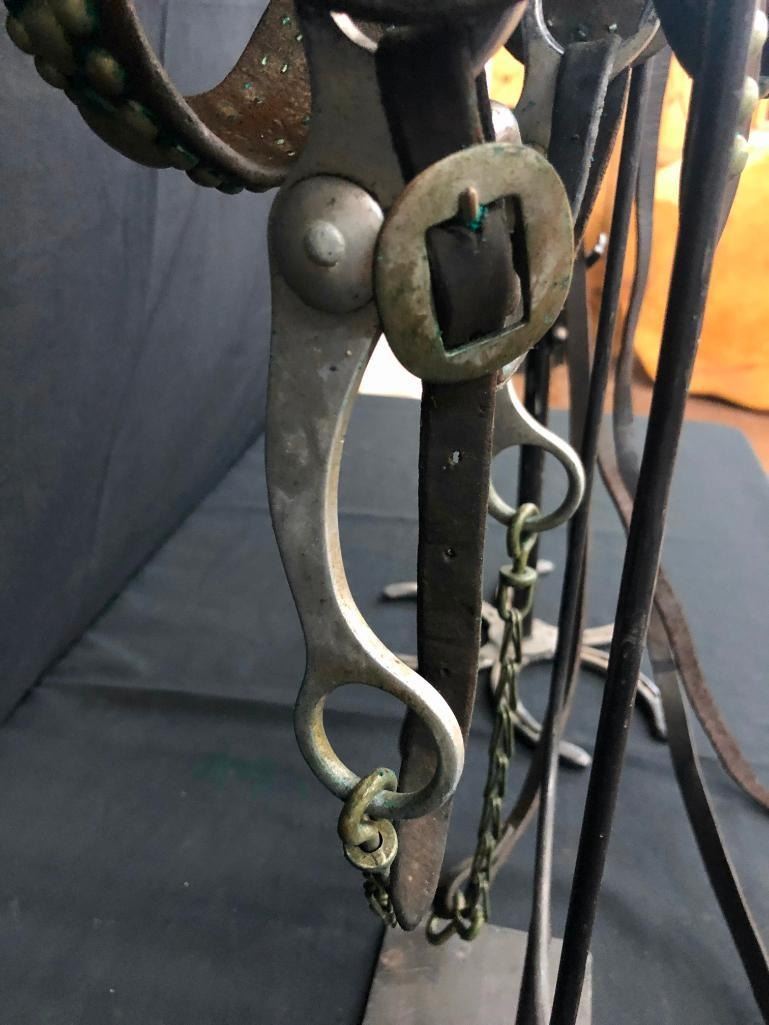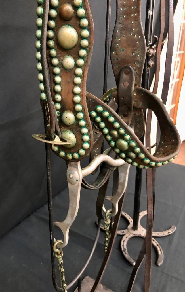 Offered for sale in this lot is an old spotted leather cowboy bridle with Crockett bit. This bridle has metal dots adorned throughout and a pair of red rosettes. Maker: Crocket Bit. Approx. Age: Early 1900s. Size: Bit mouth piece is 5 inches wide. Overall is 8 inches. Headstall is standard horse. Condition: Fair for its age, wear expected. Please look closely at the pictures - they are an important part of our description. Shipping: There will be a $10 handling / packaging fee for shipping this lot. The actual cost of postage will be added on top of that. BUY IT NOW: If you would like to buy this item now without waiting for the auction to end (this option is only available up to 48 hours before the auction starts to close), the “Buy it Now” price is the high estimate of this lot. If you would like to end the auction early and pay the high estimate (plus applicable fees), please contact us by phone or email and reference this lot number.