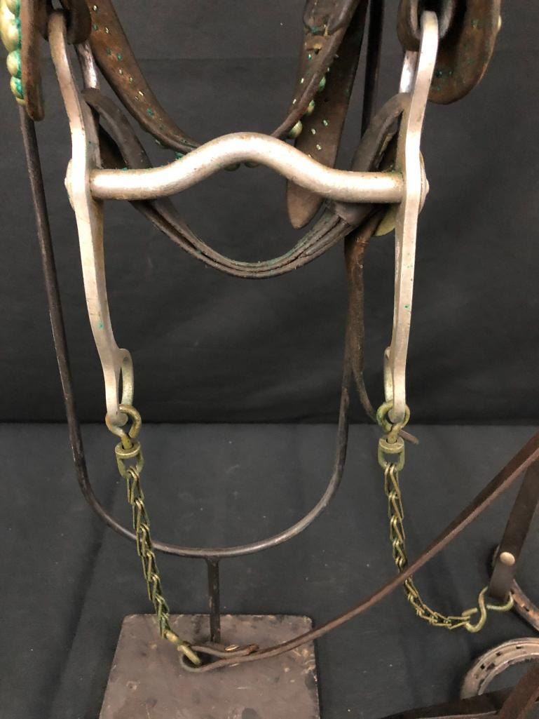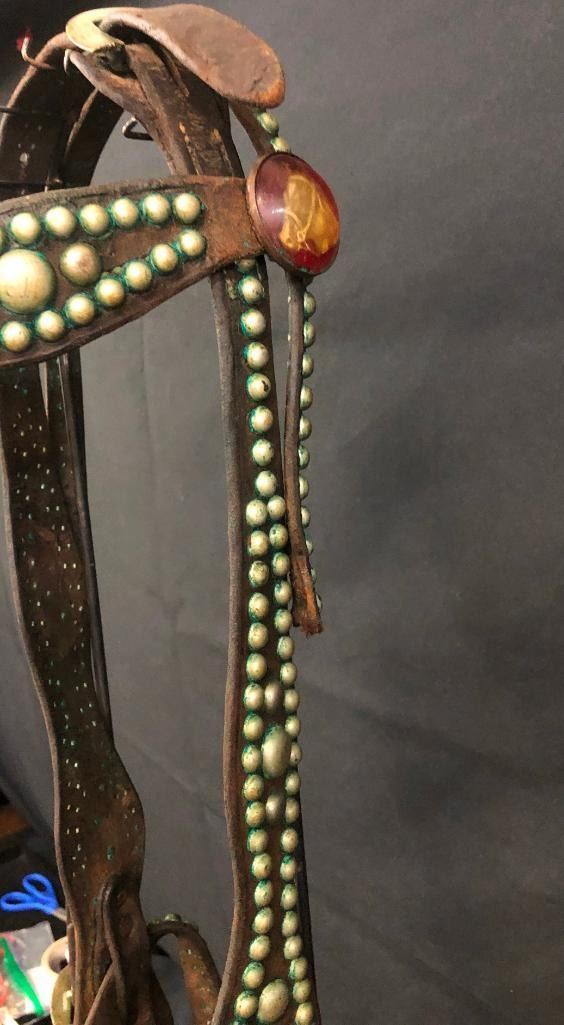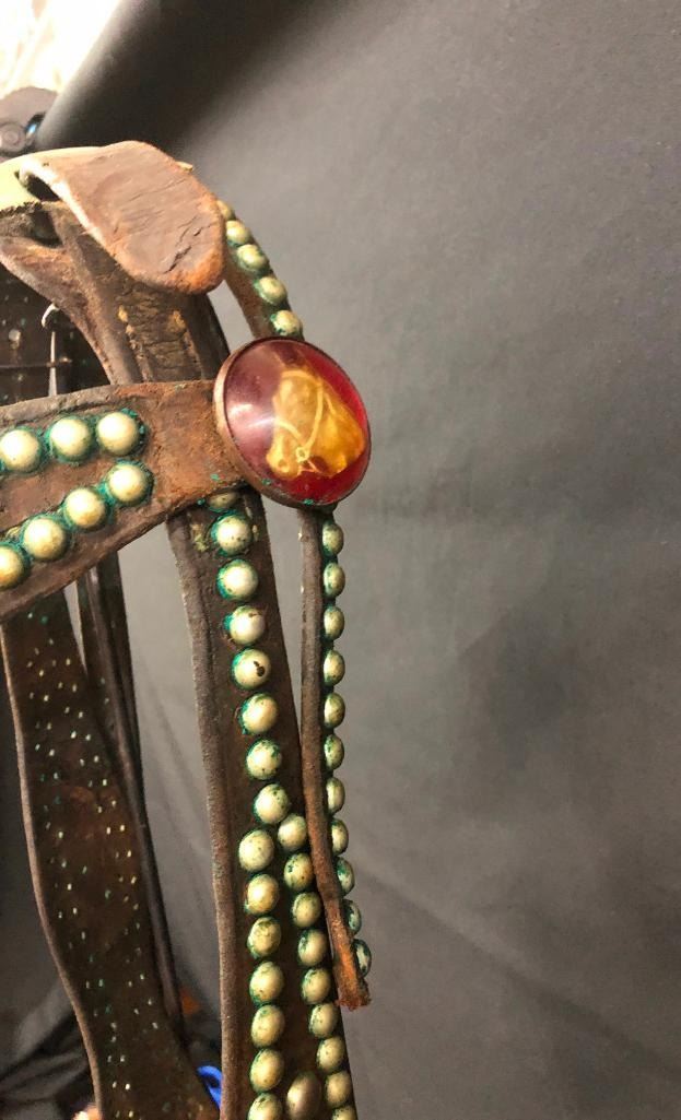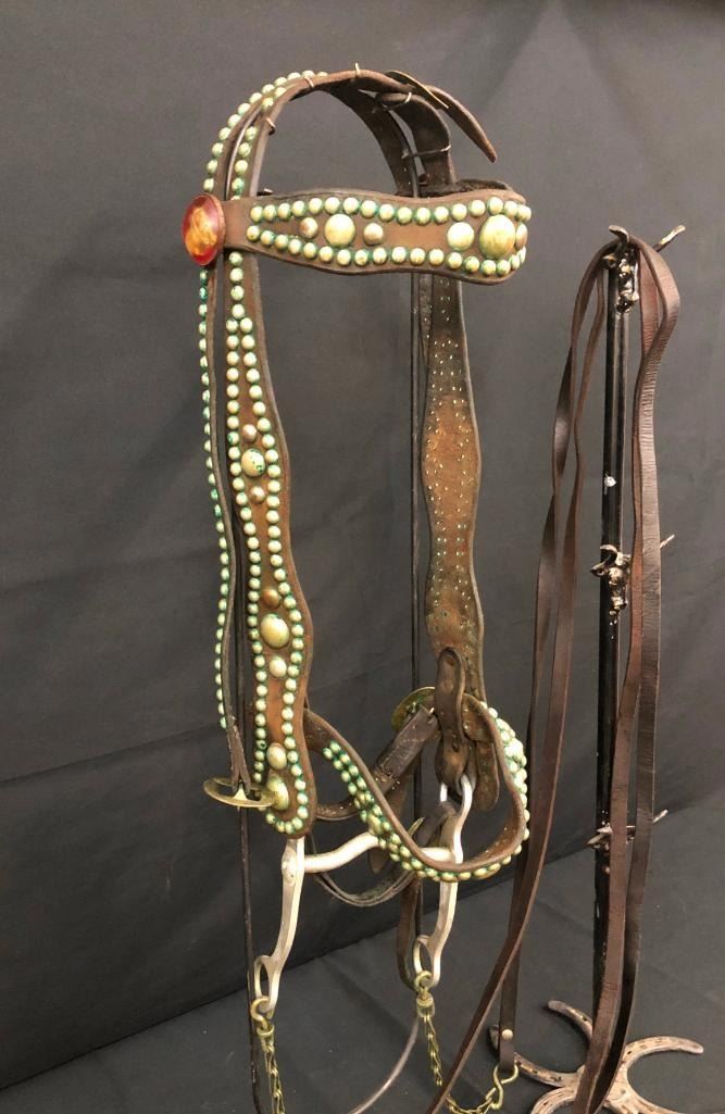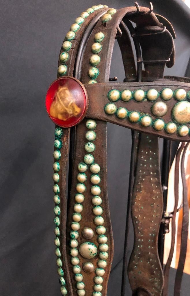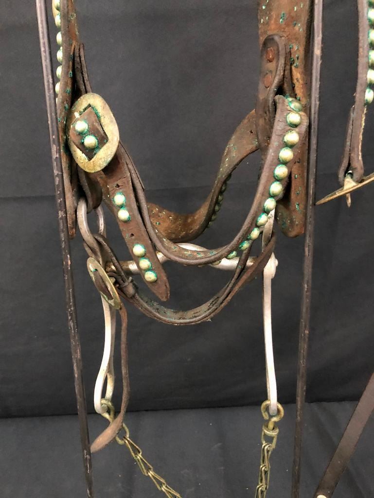Offered for sale in this lot is an old spotted leather cowboy bridle with Crockett bit. This bridle has metal dots adorned throughout and a pair of red rosettes. Maker: Crocket Bit. Approx. Age: Early 1900s. Size: Bit mouth piece is 5 inches wide. Overall is 8 inches. Headstall is standard horse. Condition: Fair for its age, wear expected. Please look closely at the pictures - they are an important part of our description. Shipping: There will be a $10 handling / packaging fee for shipping this lot. The actual cost of postage will be added on top of that. BUY IT NOW: If you would like to buy this item now without waiting for the auction to end (this option is only available up to 48 hours before the auction starts to close), the “Buy it Now” price is the high estimate of this lot. If you would like to end the auction early and pay the high estimate (plus applicable fees), please contact us by phone or email and reference this lot number.