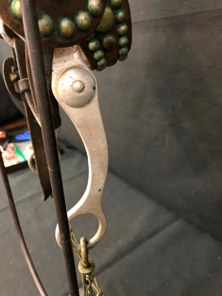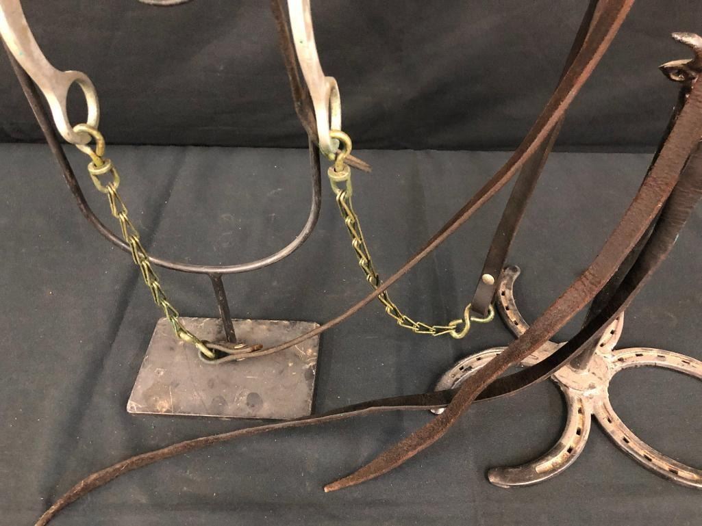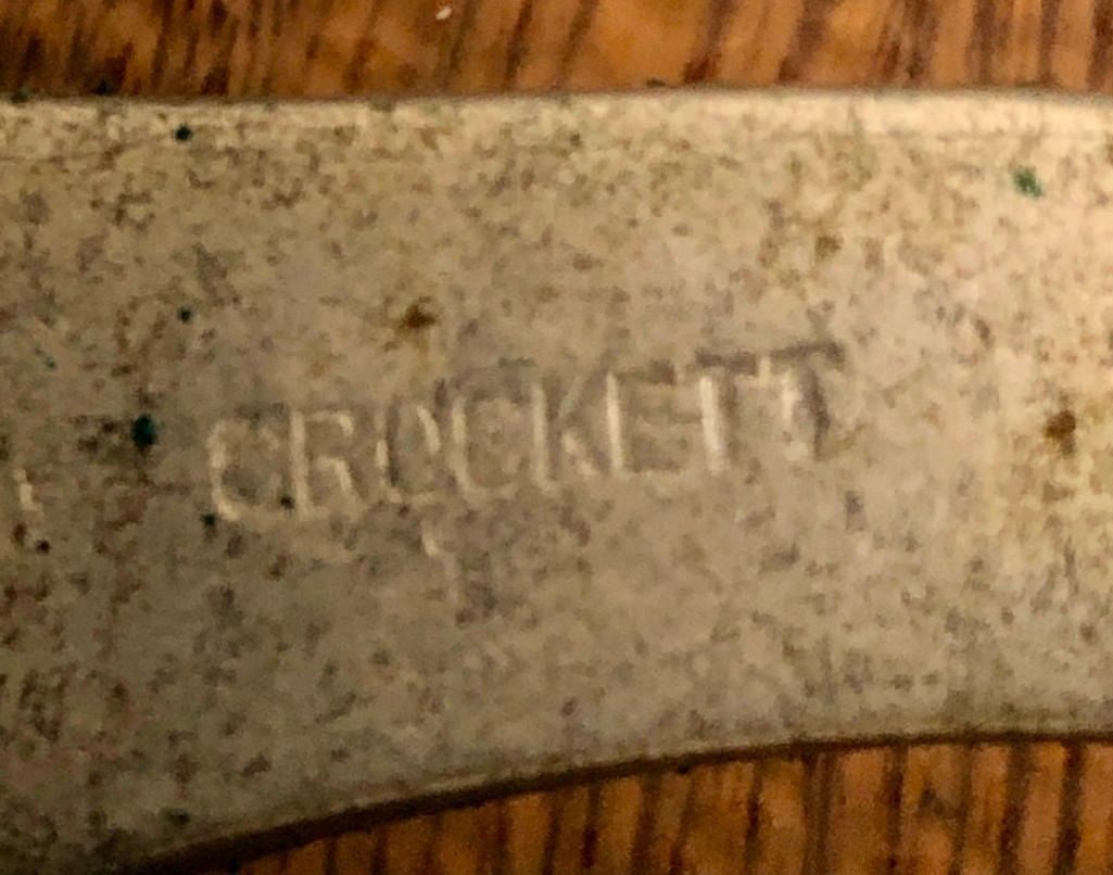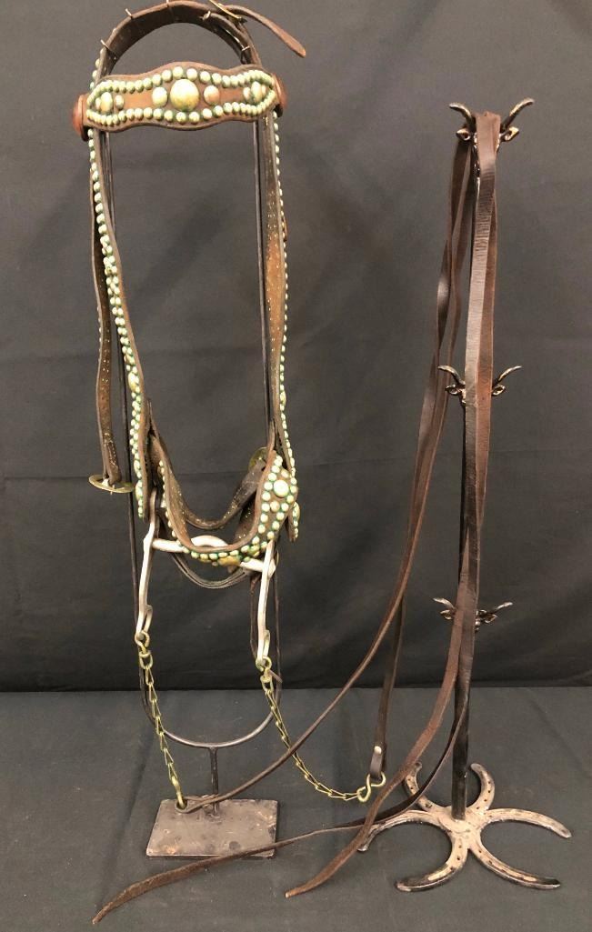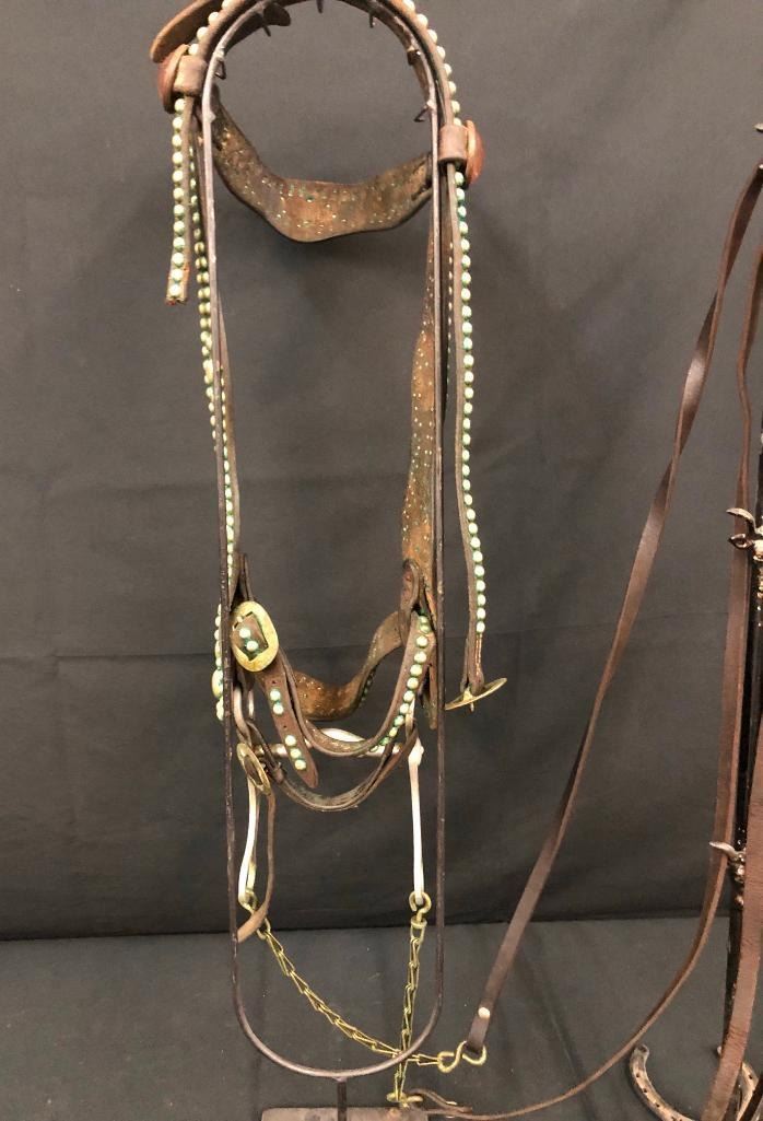Offered for sale in this lot is an old spotted leather cowboy bridle with Crockett bit. This bridle has metal dots adorned throughout and a pair of red rosettes. Maker: Crocket Bit. Approx. Age: Early 1900s. Size: Bit mouth piece is 5 inches wide. Overall is 8 inches. Headstall is standard horse. Condition: Fair for its age, wear expected. Please look closely at the pictures - they are an important part of our description. Shipping: There will be a $10 handling / packaging fee for shipping this lot. The actual cost of postage will be added on top of that. BUY IT NOW: If you would like to buy this item now without waiting for the auction to end (this option is only available up to 48 hours before the auction starts to close), the “Buy it Now” price is the high estimate of this lot. If you would like to end the auction early and pay the high estimate (plus applicable fees), please contact us by phone or email and reference this lot number.