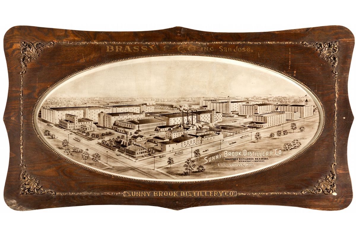 c1900 This is a very impressive behind the bar advertising sign showing pencil and ink litho of the Sunny Brook Distillery Company of Louisville, Kentucky, a company that closed in 1919 due to impending Prohibition. This sign hung in a San Jose saloon and liquor dealer called Brassy & Company, located at 66-68 South Market St. from 1887 until 1893, when it relocated down the street to 140-144 South Market St. until 1908, when it again relocated to 142-146 South Market until it closed in 1918. This old style wooden framed picture measures 25” x 46” and is ready to hang behind your back bar. - HKA#65904