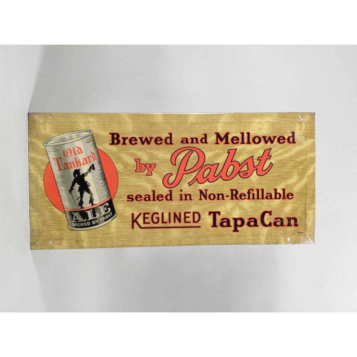 Old Tankard Ale Tin Over Cardboard String Hanger/Easel Back Sign. Brewed by Pabst. A few minor scratches and a few dents otherwise good condition. 15 X 7 inches.