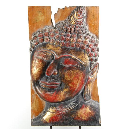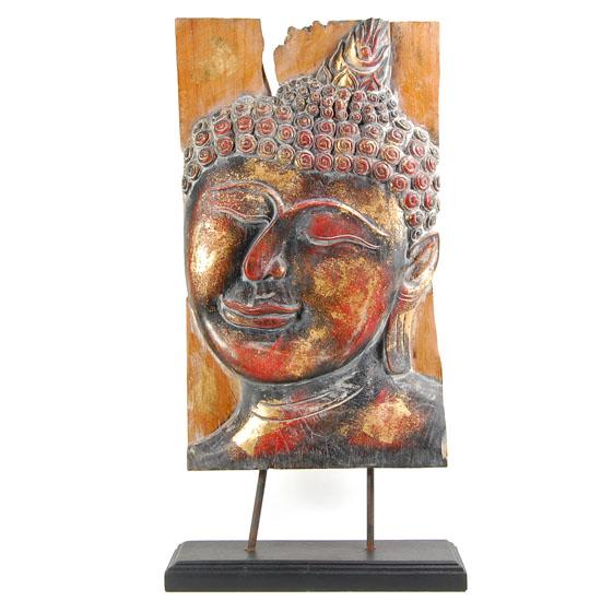 Excellent craftsmanship on old teak panel; heavy gilding; on base; 28"