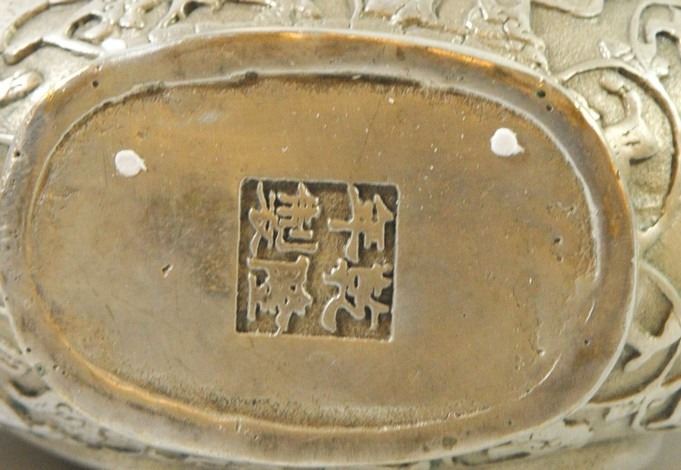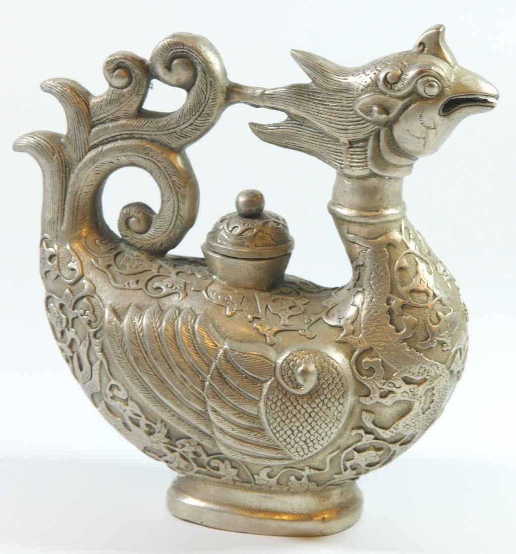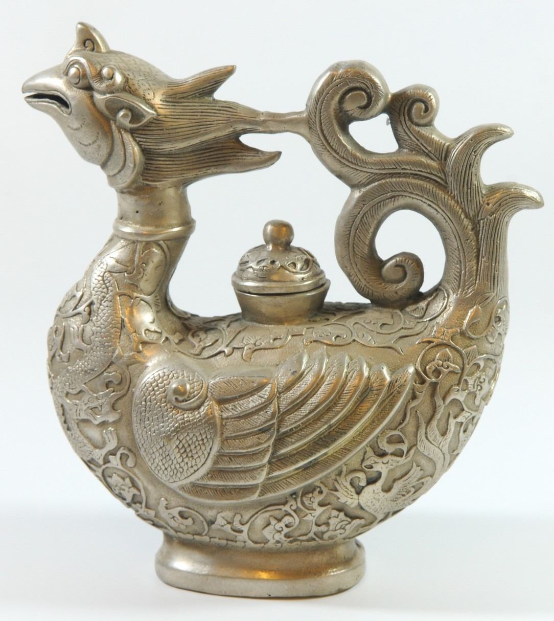 Old Tibetan kettle, (400) silver combining bronze and zinc, rooster-shaped, decorated with reliefs, signed, weight: 818 gm, height: 19 cm.