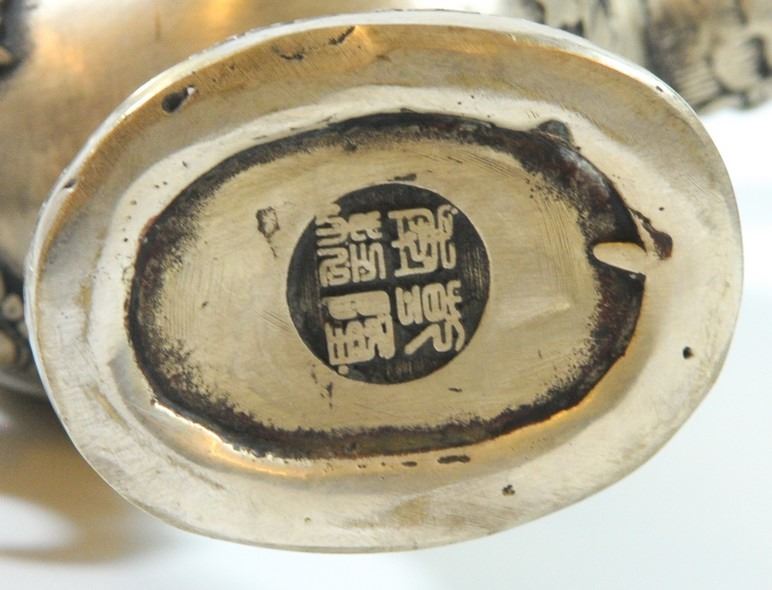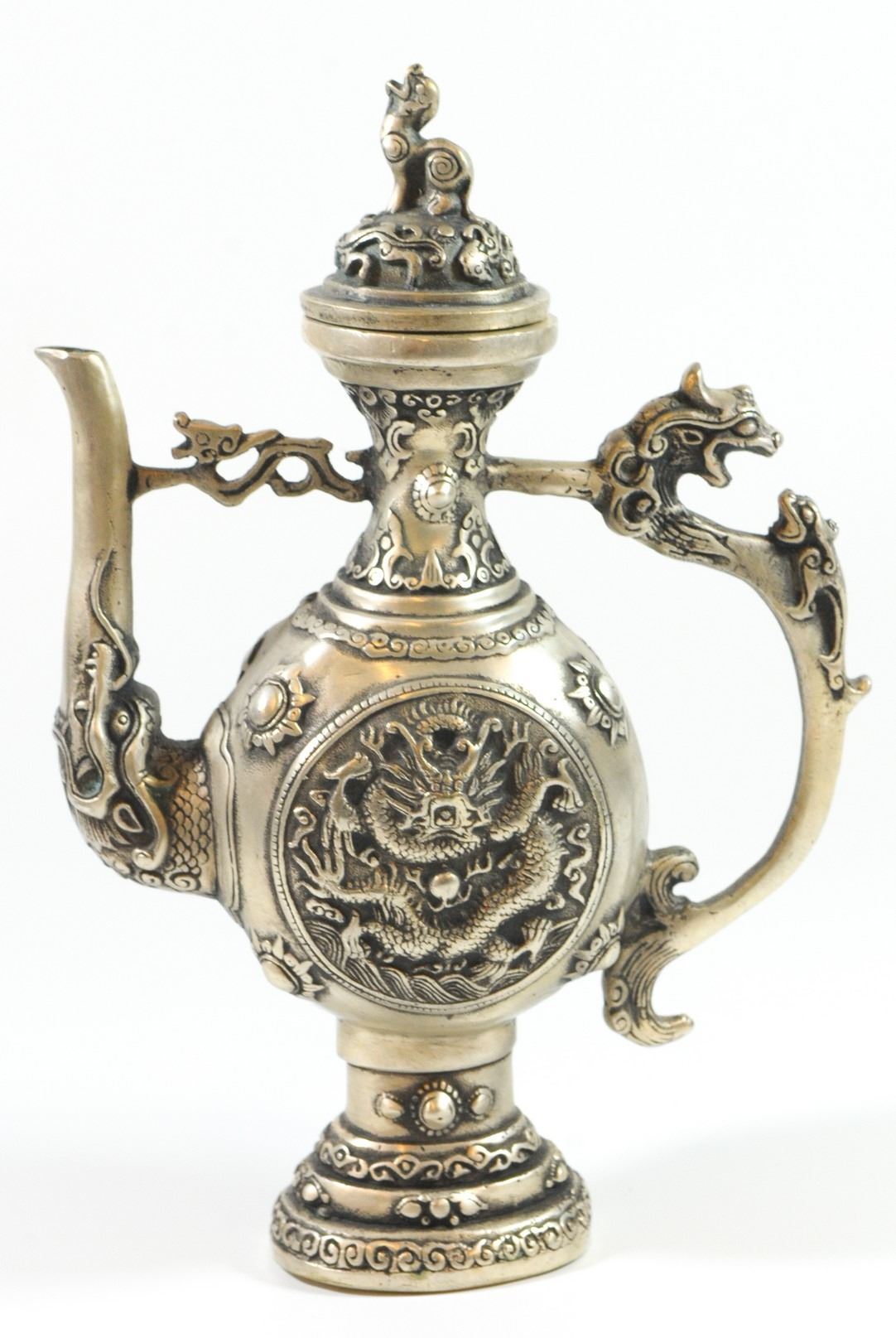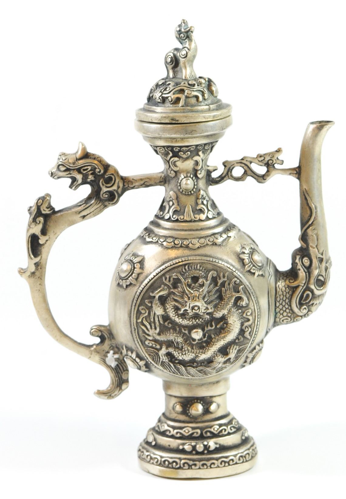 Old Tibetan kettle, (400) silver combining bronze and zinc, decorated with dragon reliefs, signed, weight: 742 gm, height: 22 cm.