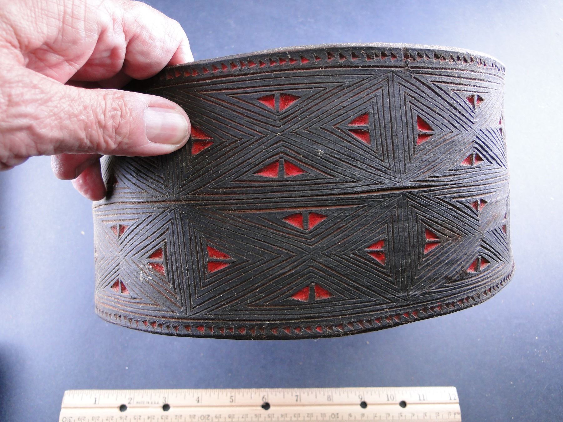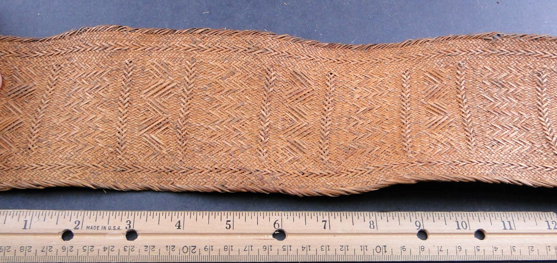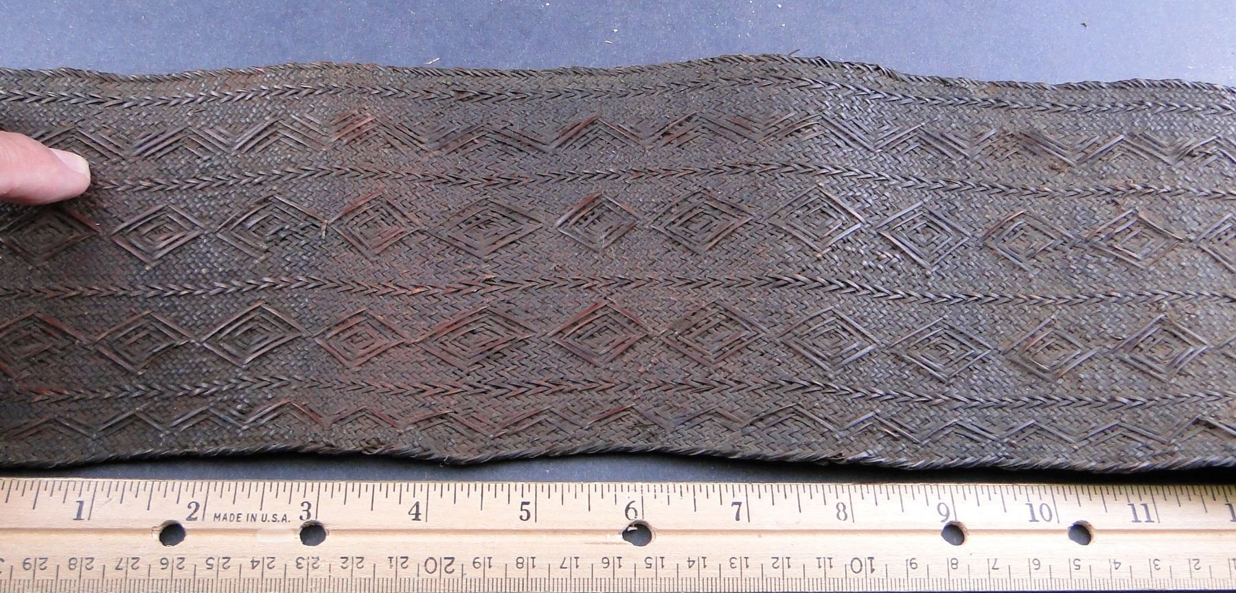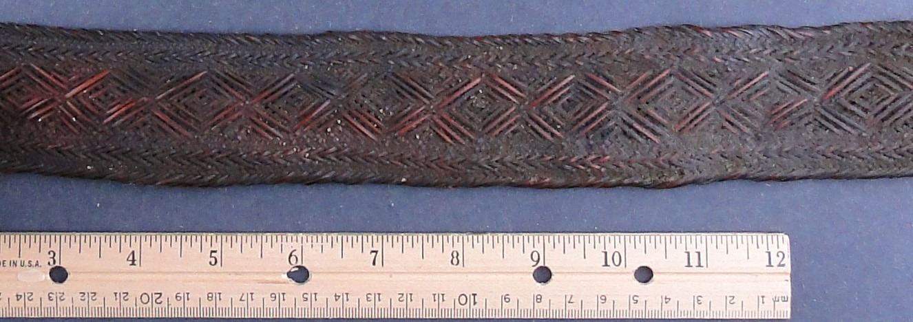 Description: Four belts used in trade, a good variety: bark belt 4-1/2" wide, carved, Mt. Hagen; plaited lily root belt 1-3/4" x 58", Mt. Hagen, old; light plaited lily root belt 4-1/4" x 30", Mt. Hagen, old; and plaited lily root belt 3-3/4" x 24", Mt. Hagen, old.