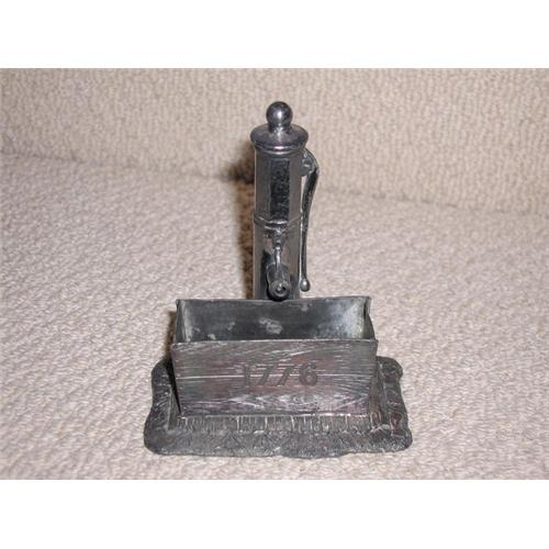 Commemorative Piece of old Triple Plate Silver. The piece is designed as a Water Pump over a Trough. The year 1776 is on the front of the Trough. On the base is the name of the company "James W.Tuft or Tufts", "Boston", and "Design Pattented Jan. 13-1880". It is a piece of Art similar to the old Silver Plated Napkin Rings or Match Holders made with figures of children or animals attached. Very Rare. I have only seen one of this kind.