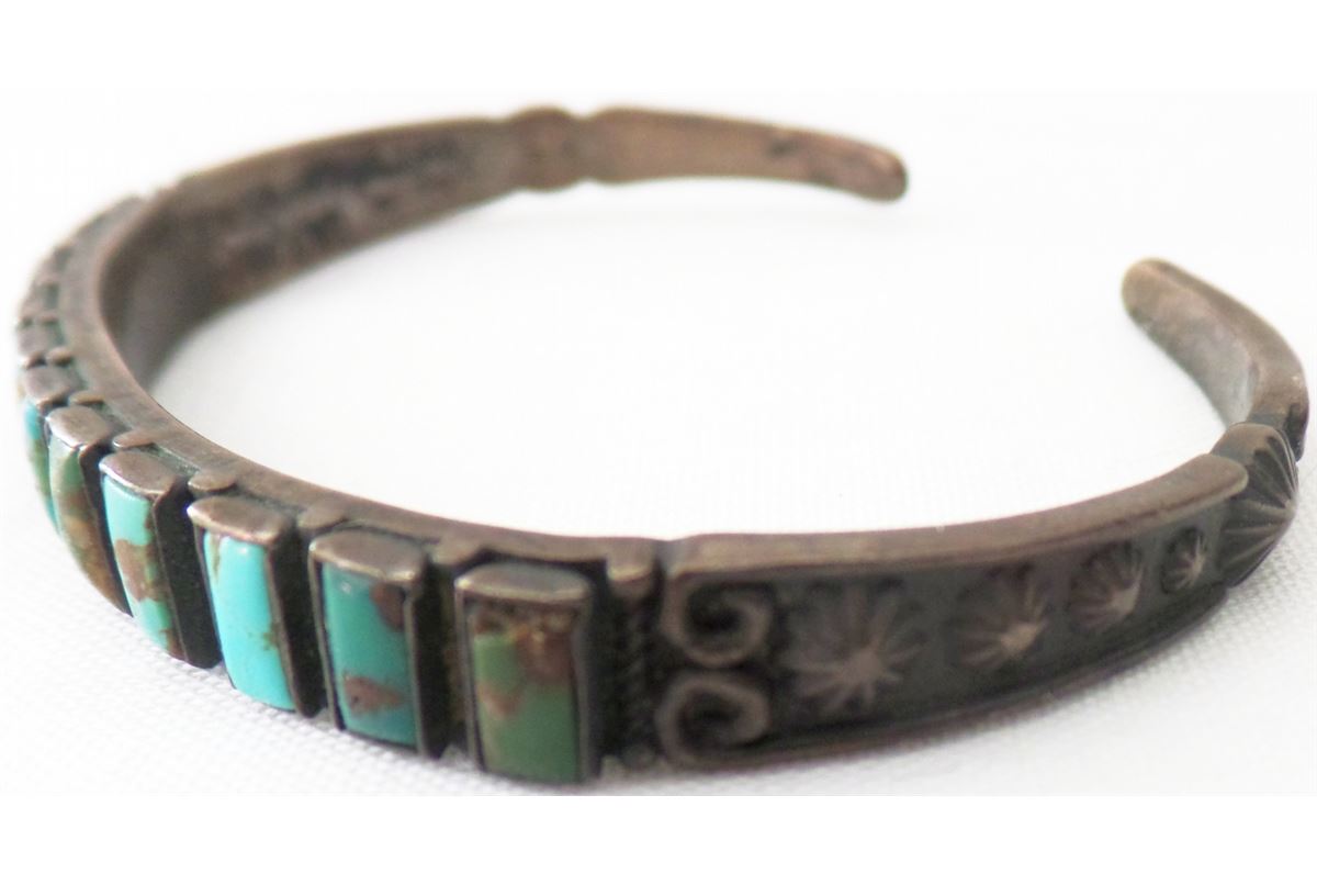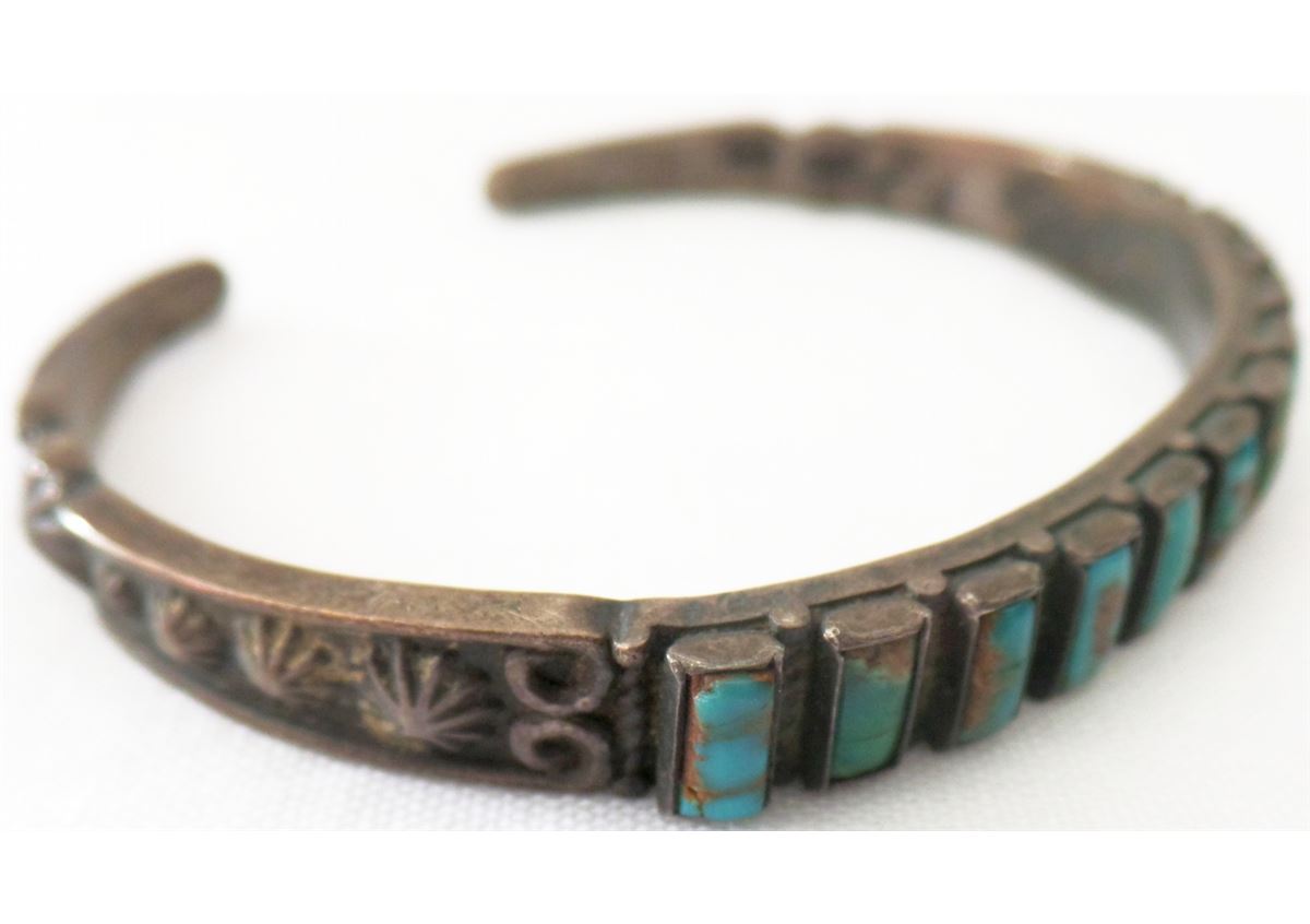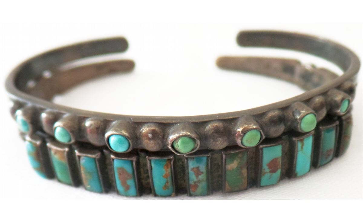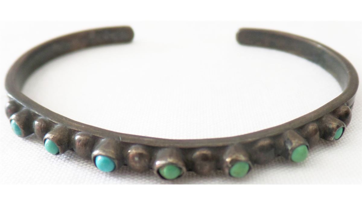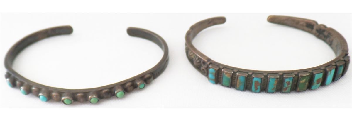 Two approximately 1920's Turquoise and Sterling Silver Cuff bracelets. One is marked Mexico Sterling. Cannot read information on the other because of the patina. The Bracelets openings are 3/4 and 7/8 inches. Approximately 6 inches and 27 grams. Very old green turquoise . These bracelets are from a Doctor's wife's estate in La Mesa. Heavy Patina. Shipping $14.50