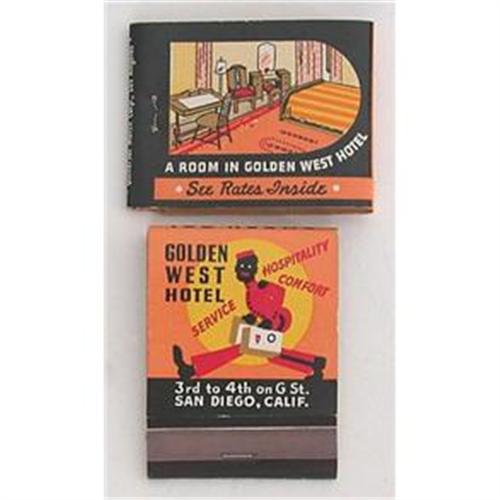 Stunning art deco graphic featuring a black bellman, advertising the Golden West Hotel in San Diego, California. Photo shows back and front cover.