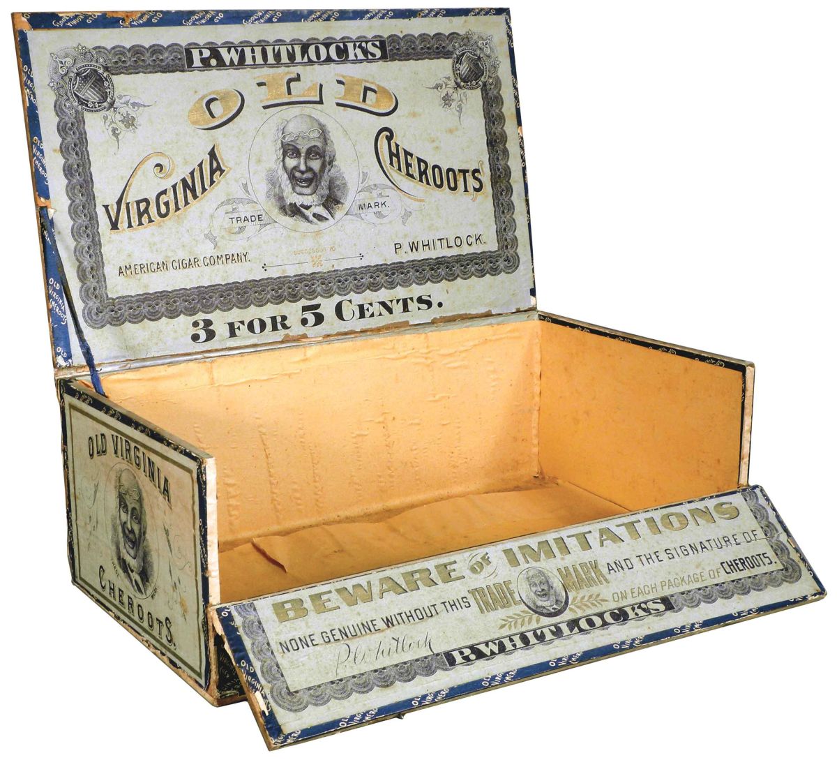 Old Virginia Cheroots Store Display Cigar Box, paper labels. Some minor wear and staining otherwise good condition. 12 1/2 X 4 1/2 X 7 1/2 inches closed. Start Price $20