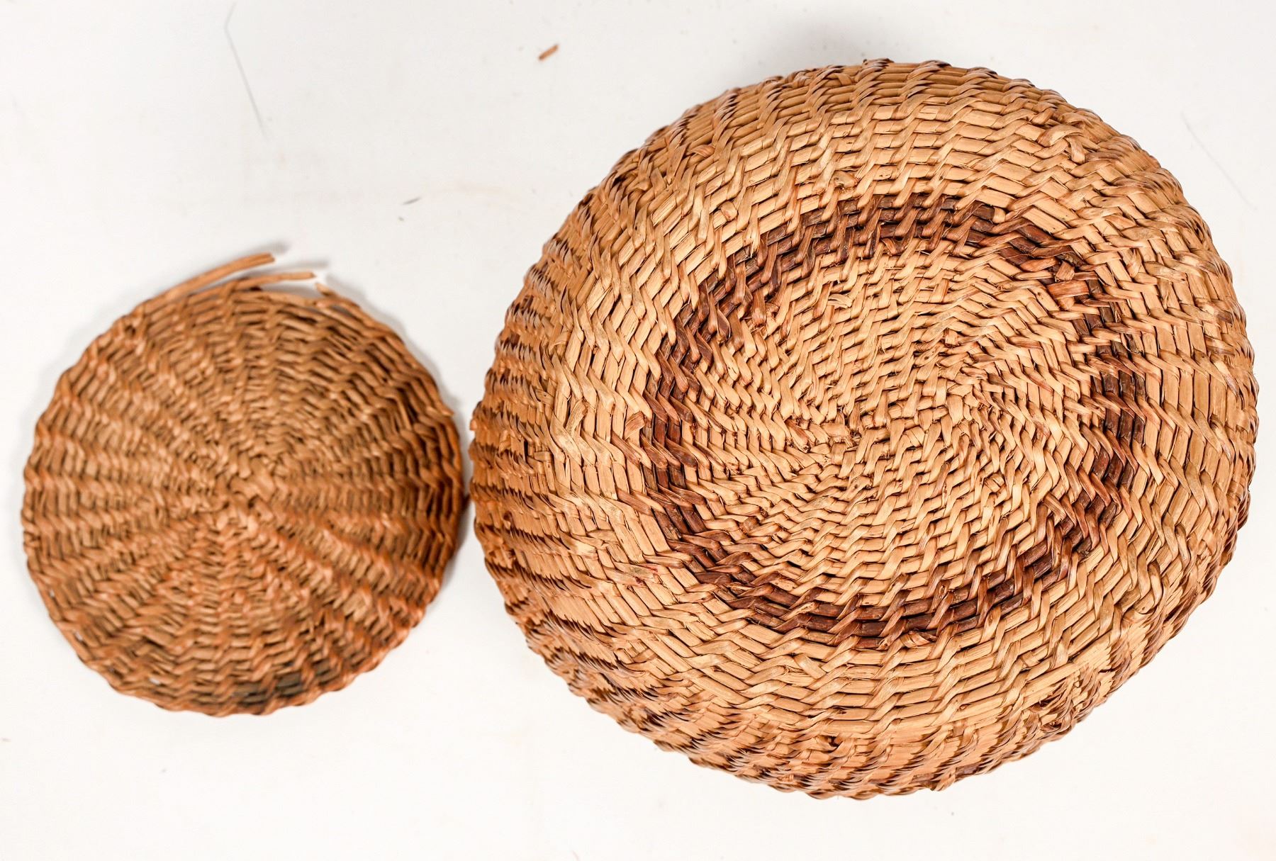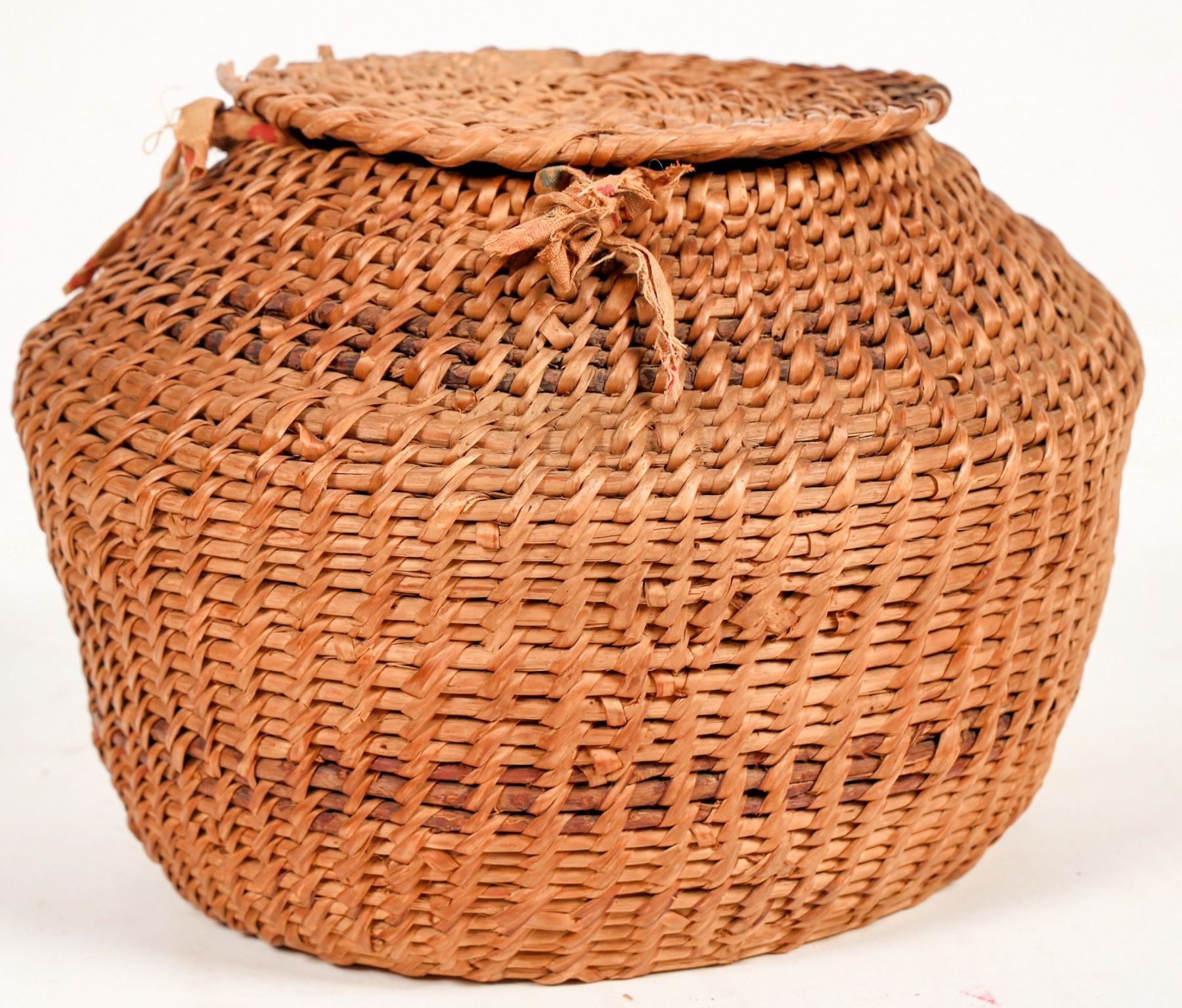 Woven basket with lid, likely made by the Washoe Tribe, who consider the Lake Tahoe basin to be their homeland. Well constructed round basket, sturdy and rigid, with sides that bow outwards. Base diameter measures 5.25" with a slightly oval shape, height measures 5", mouth diameter measures just under 4", and lid measures 4.75", fitting loosely atop the basket. The lid of the basket is chipped on the edge, breaking the weave pattern through two rows. Aside from that, seemingly good condition with minor fading of the color pattern banding the sides. See photo.