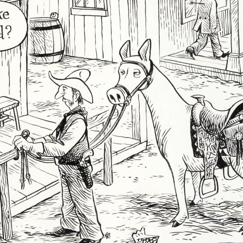 Enter a surreal and satirical world of twisted imagination and award winning creativity. "Old West Hybrid" is an original pen & ink drawing on paper by Dan Piraro, creator of the critically acclaimed and award winning comic strip, Bizarro! This piece is hand signed and comes framed. Includes Certificate of Authenticity! Measures approx. 22.5" x 16.5" (with frame), 13" x 7" (image). ** Please note: there is minor wear to the corners of the frame. **