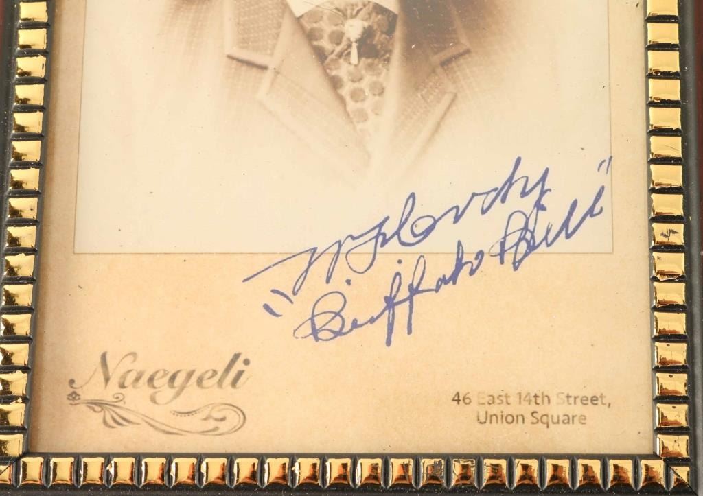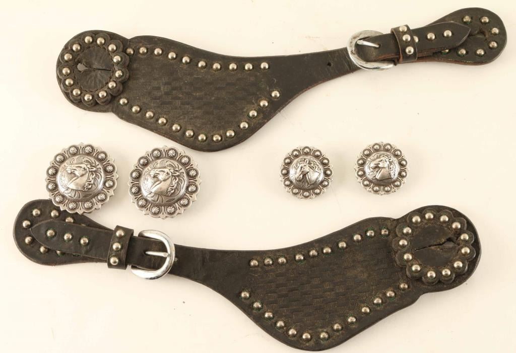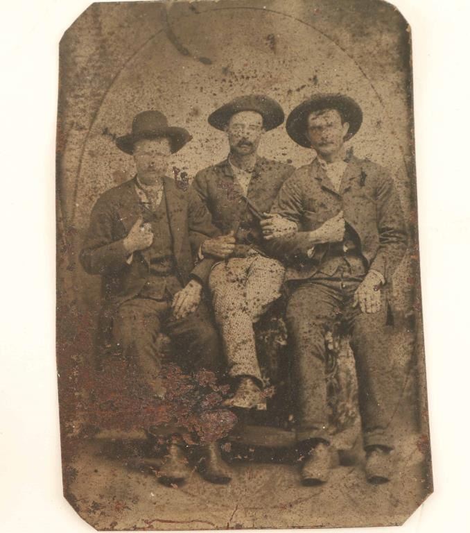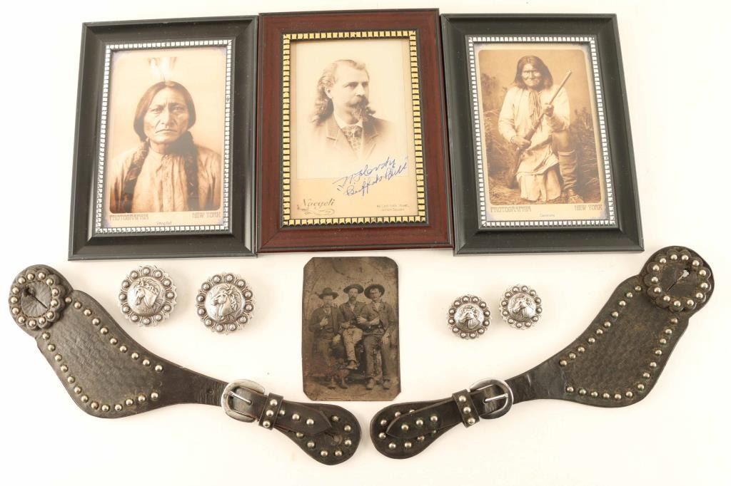 Includes a pair of Old West Cowboy leather spur straps; straps are tooled with nickel buckles and many small nickel rivets, a Old West Cowboy Tin Photo depicting three cowboys; measures 2" wide by 4" tall, and lot also includes (3) Cabinet Card Photograph reprints with (1) Buffalo Bill, (1) Sitting Bull, and (1) of Geronimo.