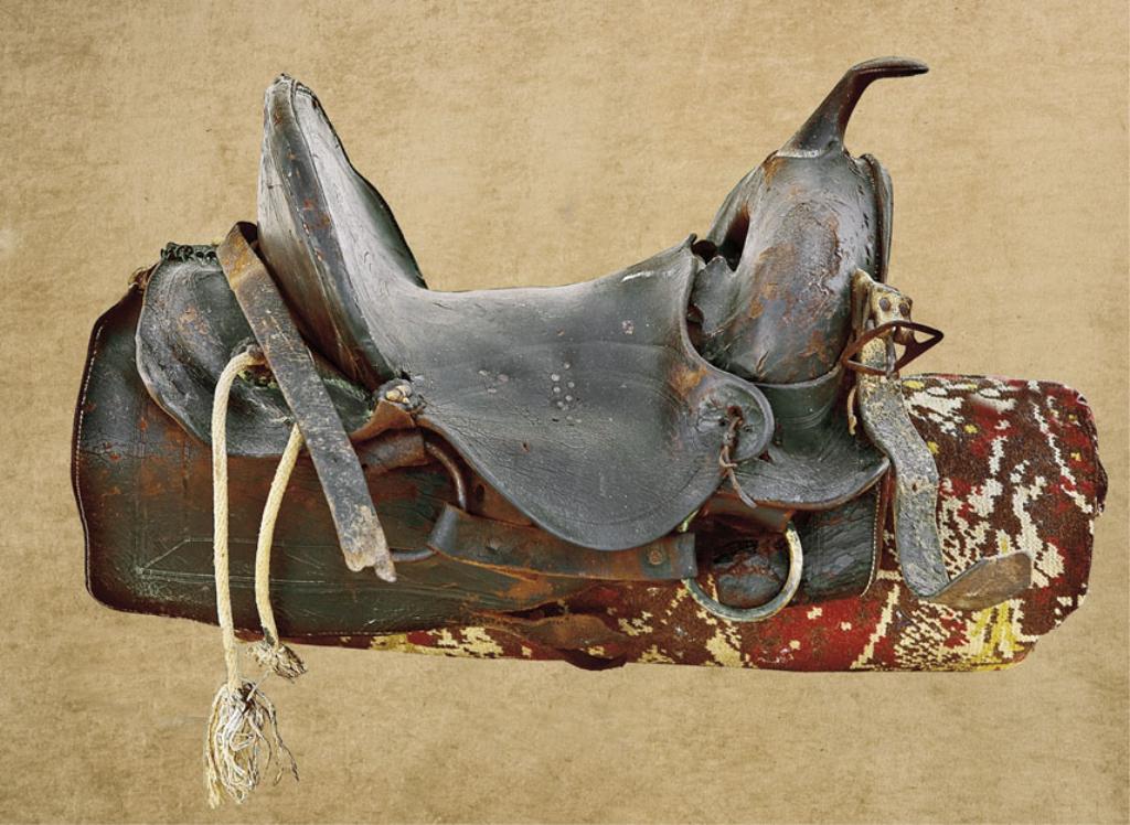 Old Western style saddle marked on rear of seat “Made on 101 Ranch, Bliss Ocla”. The saddle is heavily used in near relic condition. Definitely original marking from a lifetime collection. Est.: $300-$600