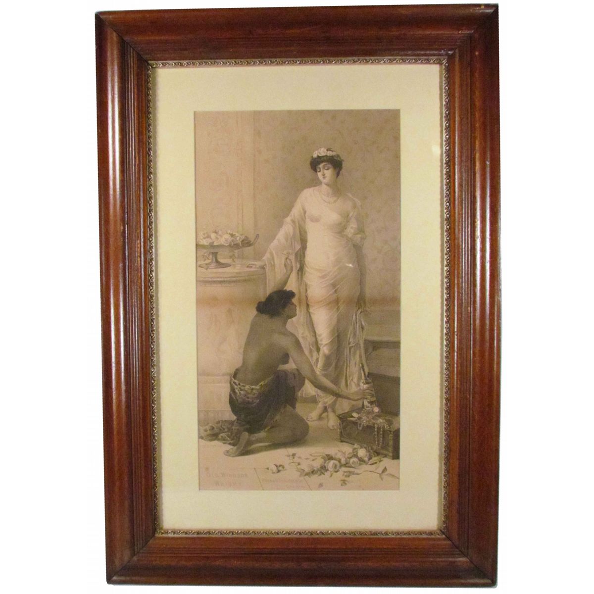 Old Windsor Whisky Paper Sign. Frank G. Tullidge & Co. Cincinatti. Depicting slave attending to her mistress, siepeitone. Age streak across center otherwise very good condition. Frame in period oak. 23 1/2 x 33 1/2 inches overall.