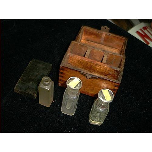 Gold Testing Kit with 3 bottles and metal bar. 2 have glass droplets inserts inside them. Nice old wooden box also. Box needs back hinges. </em></td>