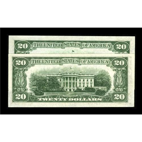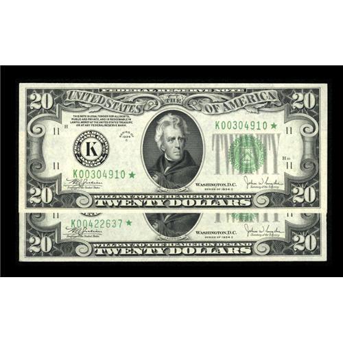 <B>Old and New Back Design Dallas $20 Stars.<BR>Fr. 2057-K* $20 1934C Federal Reserve Notes. Two Examples. Gem Crisp Uncirculated.</B></I><BR>Both of these embossed stars have ample margins and they are neatly centered. The "New Back" star is also the listed high in Schwartz. Of the two designs, we've only handled an "Old Back" Dallas star before and that was when we sold the massive Taylor Family Collection.<BR><BR><b>Shipping:</b> Coins & Currency (<a target="_blank" href="http://www.heritageauctions.com/common/shipping.php">view shipping information</a>)