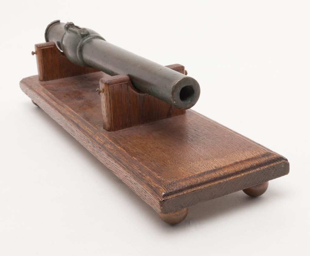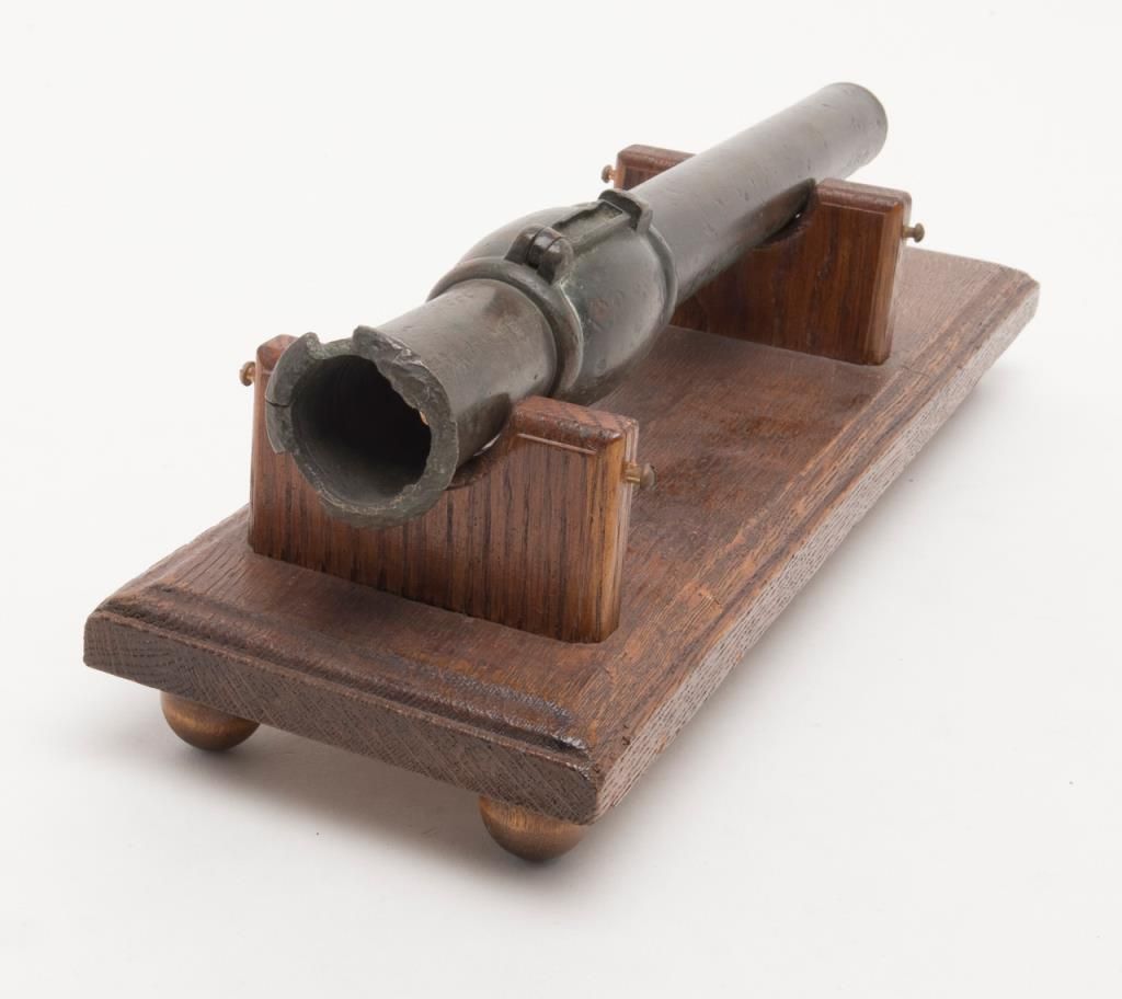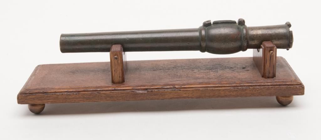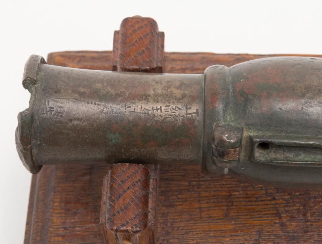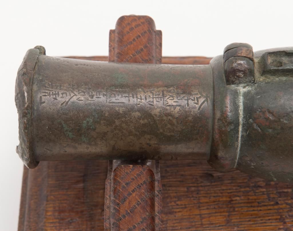Old brass Chinese hand cannon with Chinese characters at breech, approx. 14” overall, heavy patina, some damage to breech rim; on modern oak display stand. Est.: $300-$600.