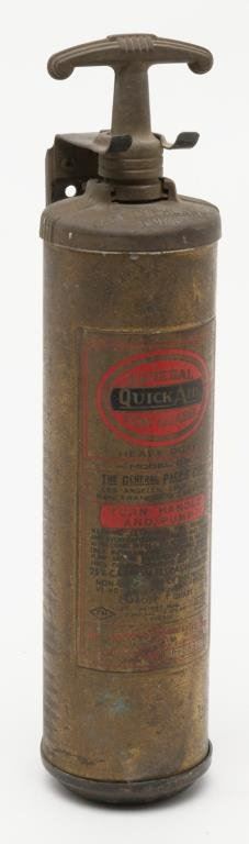 Old brass QuickAid fire extinguisher with wall bracket, approximately 13” long. Est.: $25-$50.