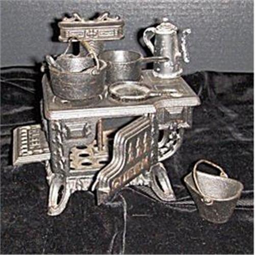 This is a reproduction old fashioned cook stove with coal scuttle and pots, pans etc. The oven door opens and all of the burner lids come off. Very realistic! It is an art form from yesteryear and would be delightful in a kitchen or dinette...