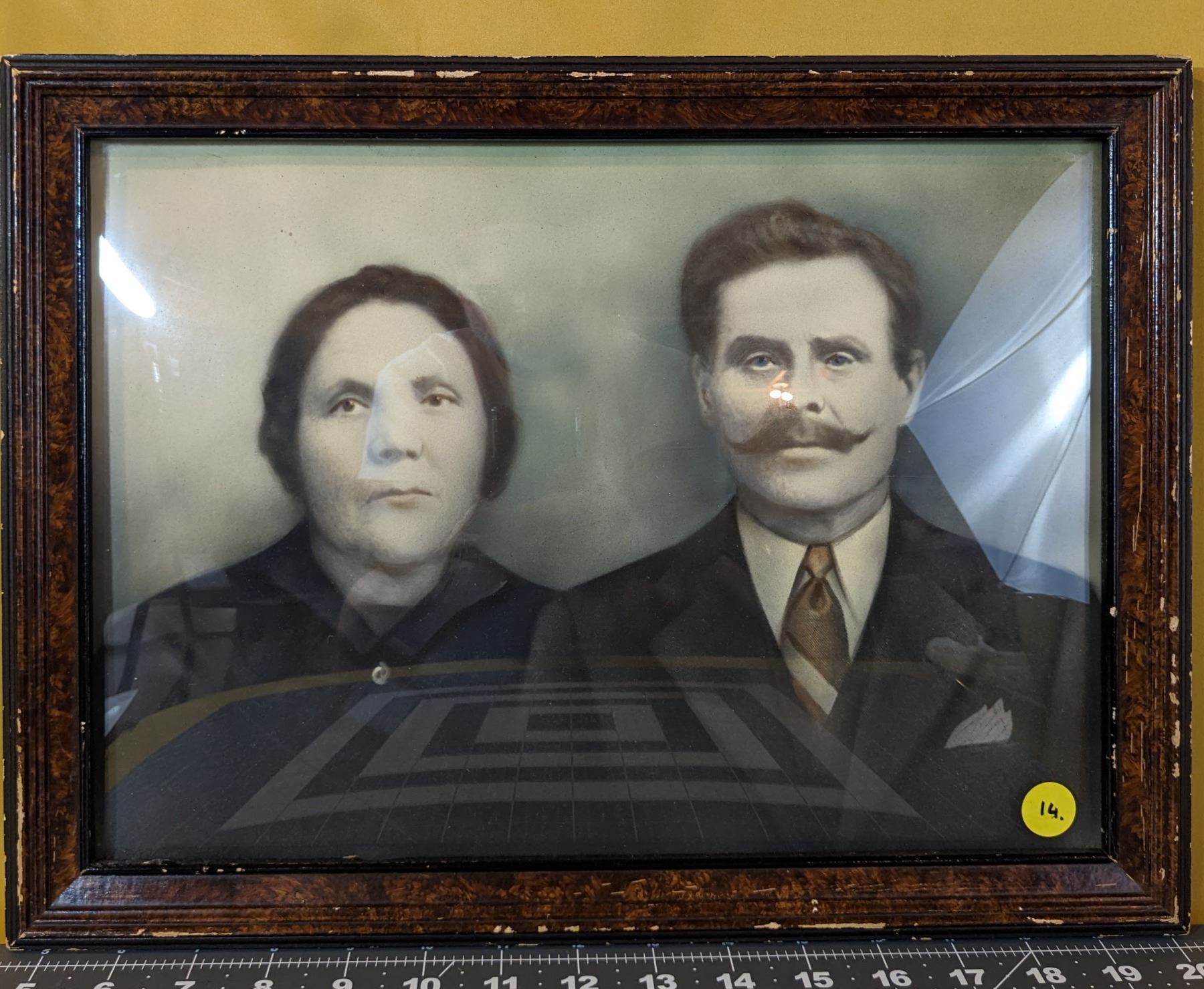 Old family portrait. Concave glass. Some wear and tear on frame. 16 in x 12 in.