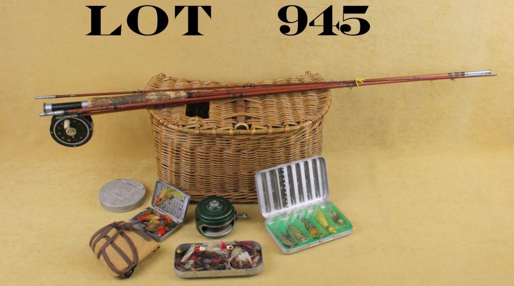 Old four section fishing rod with Pflueger Medalist reel in overall good condition for age; accompanied by a creel basket that is in overall good condition and containing three tins of flys and lures, an older circularleader tin, a cloth rod cover and a spare Shakespeare silent Model GD reel. Est.: $100-$200.
