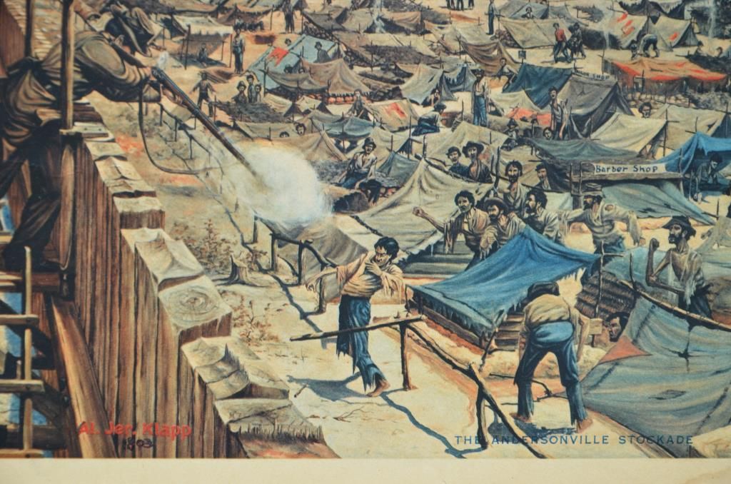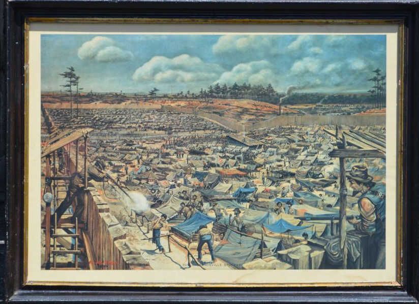 Old framed color print of the Civil War Andersonville Confederate Prison camp, approx. 19” x 26” in overall good condition; some slight water damage along the bottom and top edges but not affecting the image.Est.: $150-$300.