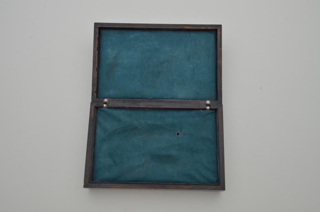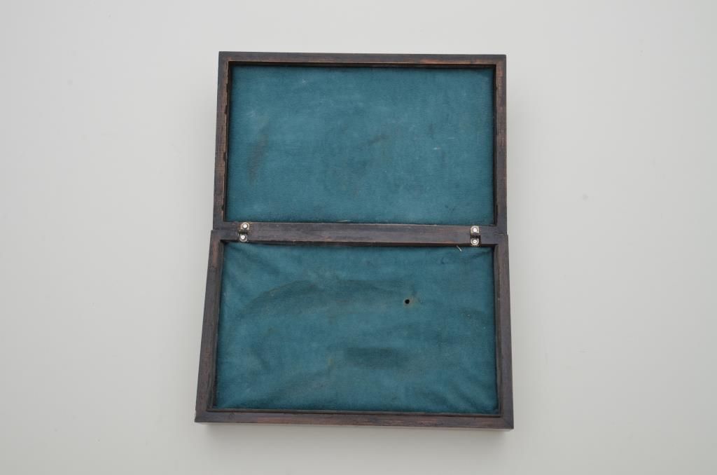 Old hand-made wood case for a pair of small single shot derringers, approx. 8-1/2” x 5-1/2” x 2-1/2” in overall good condition. Est.: $150-$300.