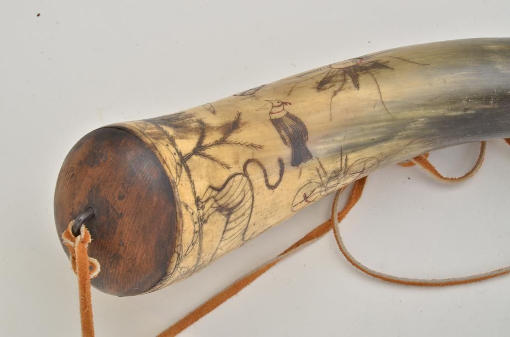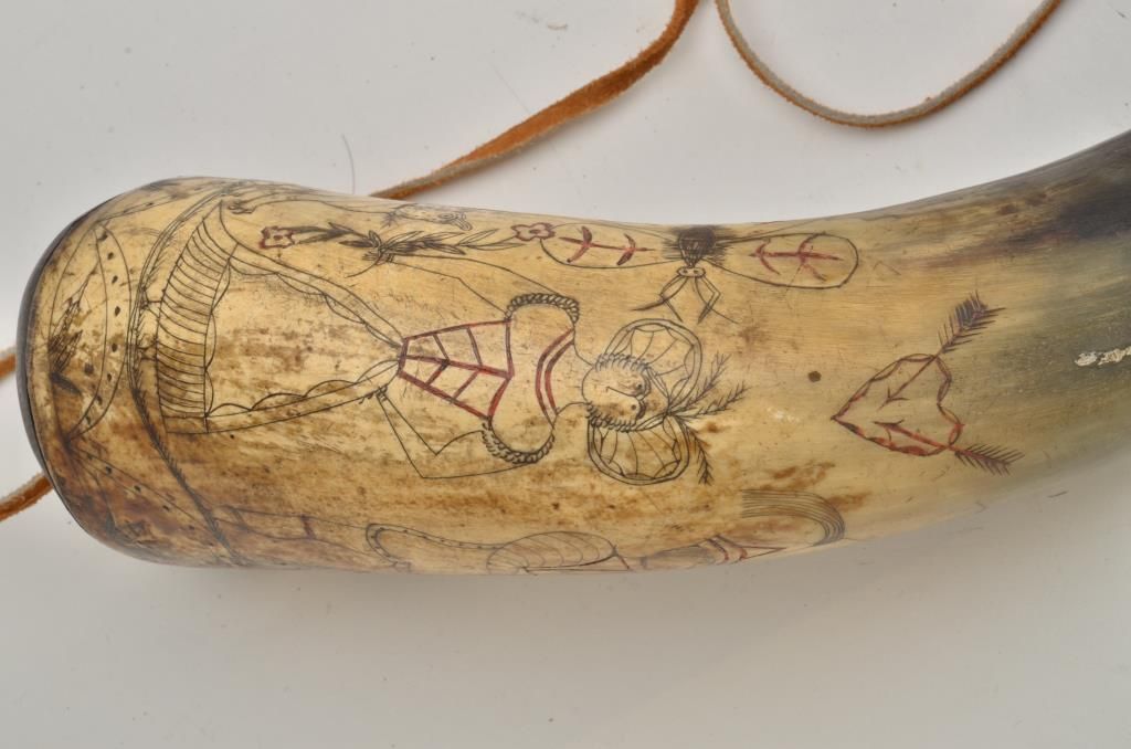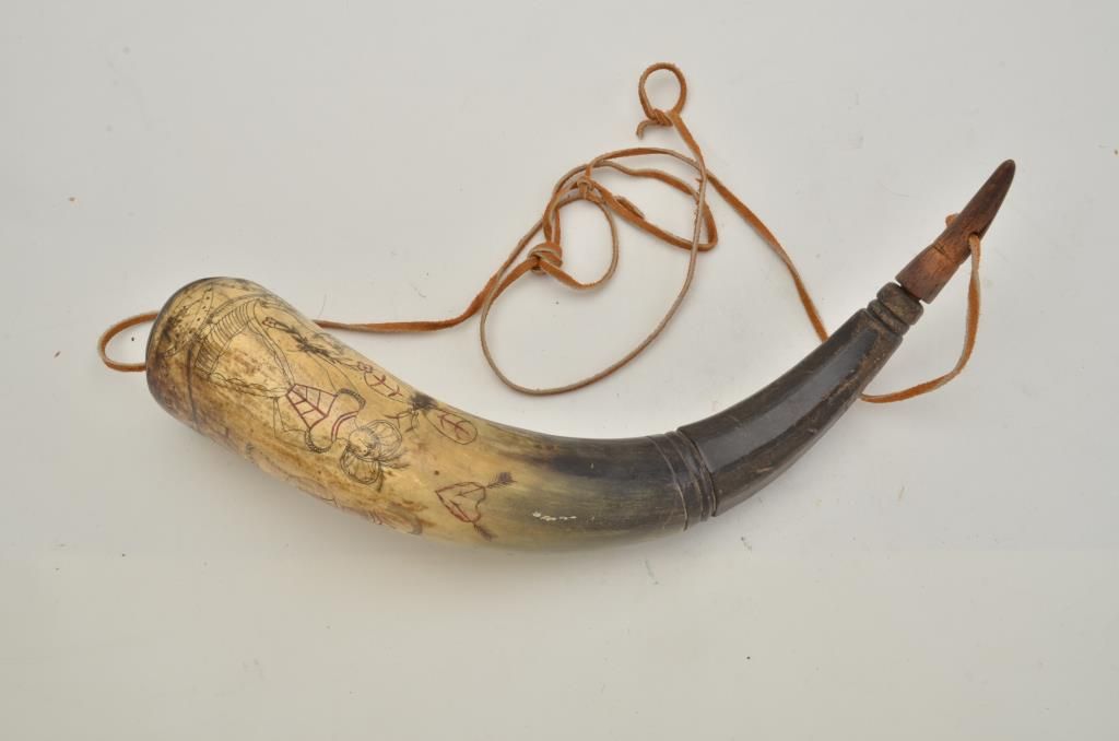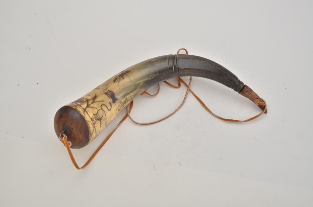 Old heavily carved powder horn approx. 15” overall with wood plug and wood cap; scenes include a man wearing chain mail armor holding a sword and shield, ready to defend his Lady-Fair who is holding a bouquet, froma cougar size cat and a flying insect that is larger than the cougar; the couple’s romantic attachment is symbolized by a heart above their heads that is pierced by two of cupid’s arrows; a large sun with face is also in the sky along with plants on the ground and a flying bird; a great looking piece of folk art! Est.: $250-$500.