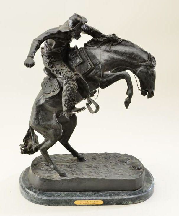 Old high quality re-cast large bronze of a cowboy on a bucking horse with lots of action, by Frederic Remington, approx. 23” in height including stone base and approx. 16” long in overall very good condition showingnice detail and patina; from an old estate. Est.: $400-$800.