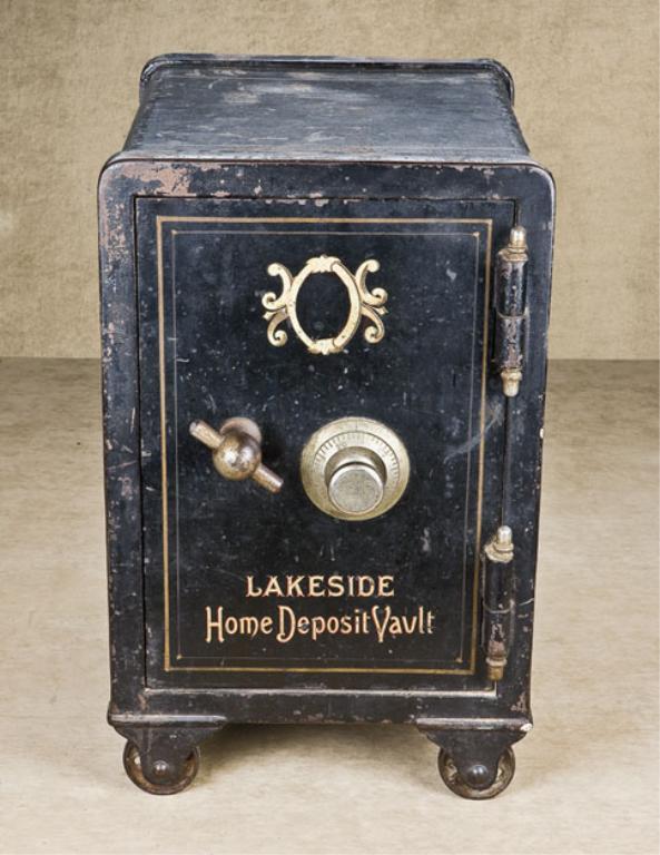 Old iron floor safe approx. 11” wide, 13-1/2” deep and 14” high on iron wheels in overall good condition showing considerable original black paint with gold accents including on the door “Lakeside Home Deposit Vault” with combination lock and separate handle bolt on door; interior shows two side drawers and colorful carpet on the bottom interior. A really classic looking Old West era safe. Perfect for the gunroom or office. Est.: $300-$600.