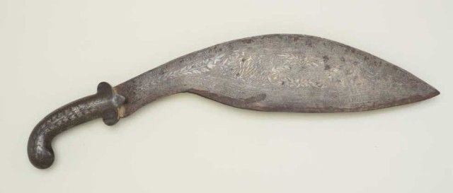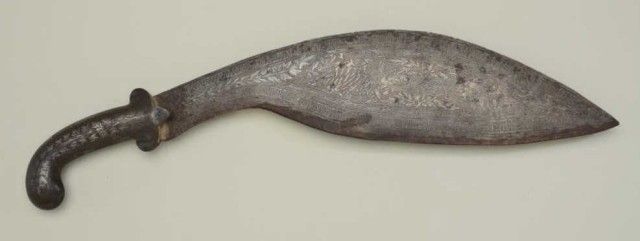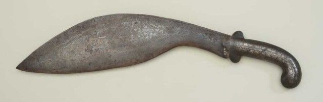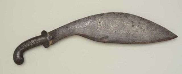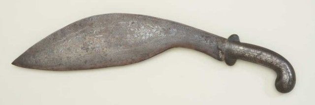 Old large curved and etched flamboyant blade knife from India with metal silver decorated grip in overall good uncleaned condition, approx. 20” overall with blade 4” at widest point, lion on right side of blade chasing adeer; definitely not a tourist piece but the real thing! Est.: $200-$400.
