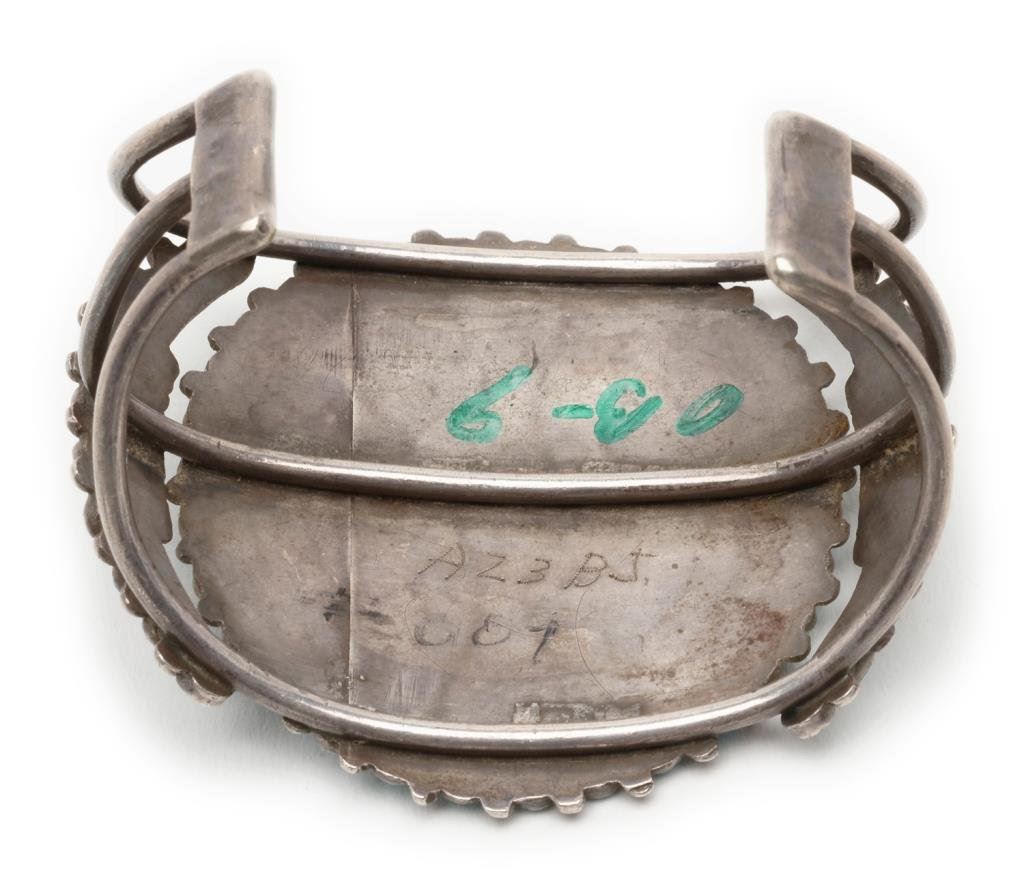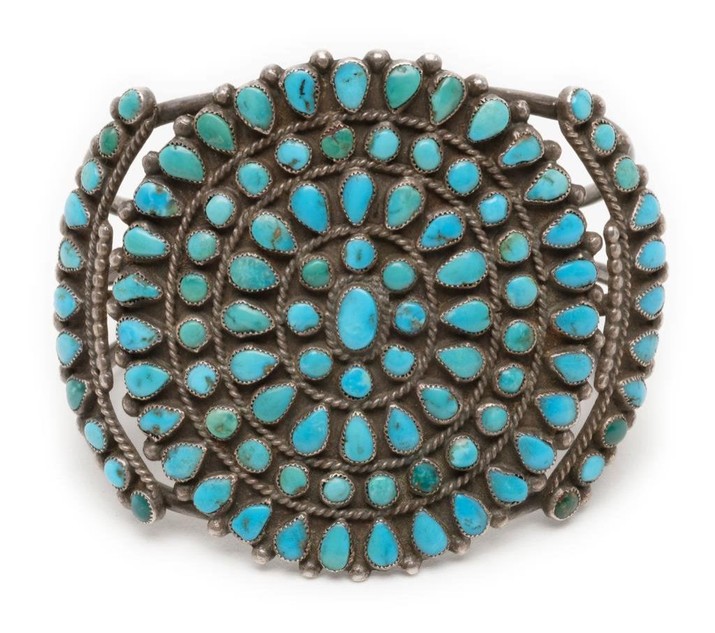 Old pawn silver and turquoise bracelet marked “AZ3BJ” on the back side of the face of the bracelet; in very good overall condition with nice patina and very nice stones. Est.: $250-$350.