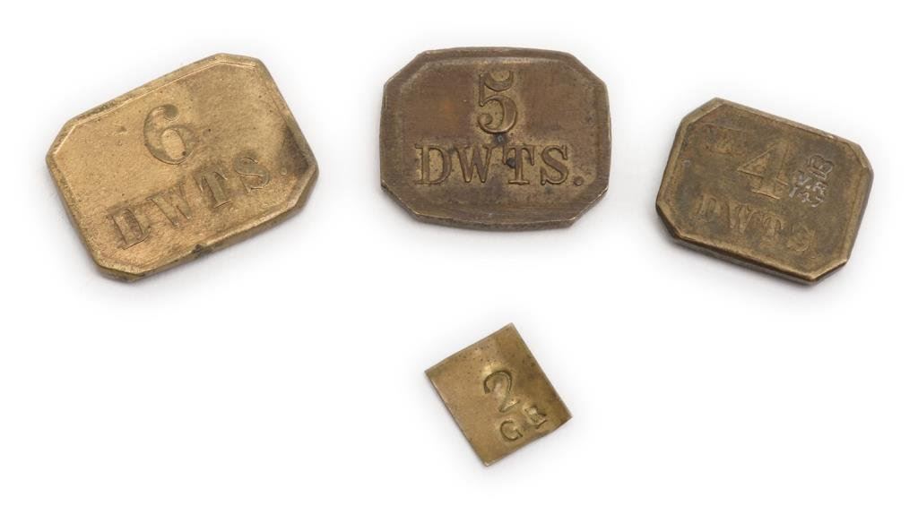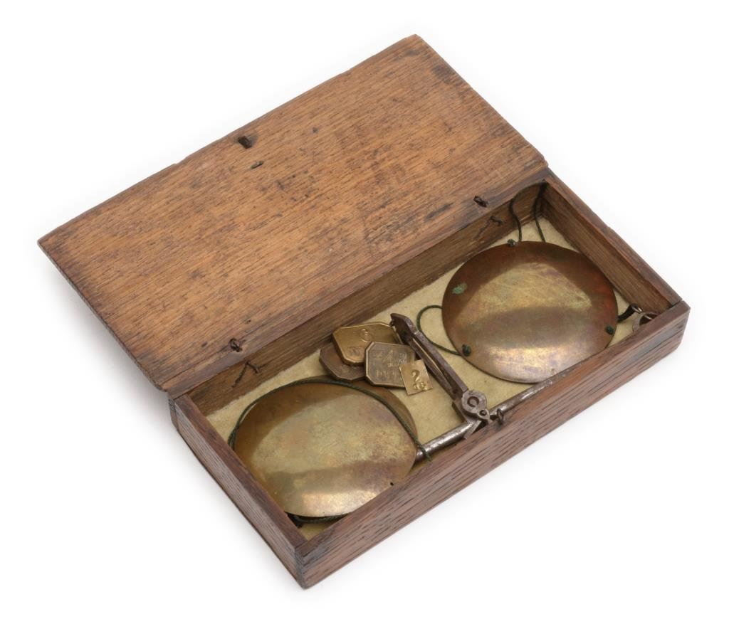 Old portable mining balance scale and weights in wood box, approx. 6.5” x 3” x 1.25”; includes iron balance beam, brass pans and misc. brass weights. Est.: $100-$200.