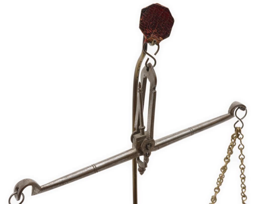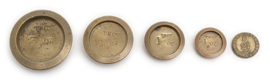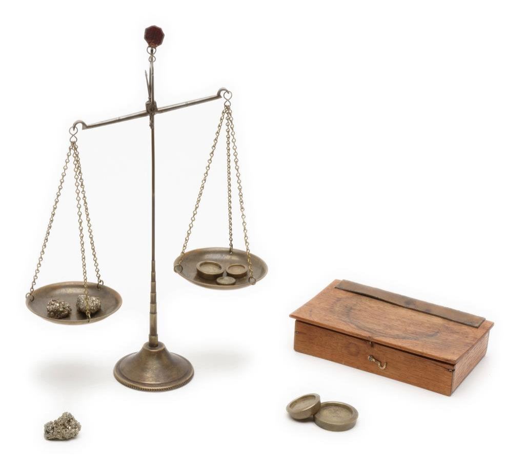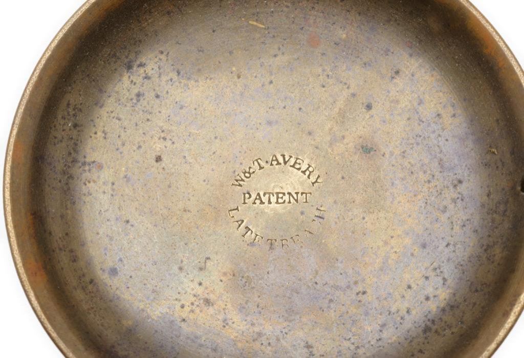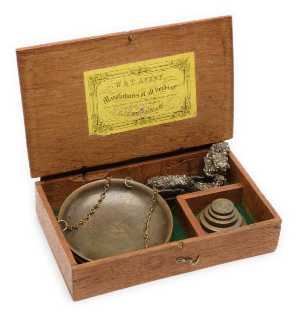 Old portable mining scale in wood box with separate brass displaying stand. The box is approx. 7.5” x 4.5” x 2”; the balance beam is iron and the pans are brass and marked “W. & T. Avery, Patent”; with weights and some pieces of “fool’s gold”. Est.: $150-$300.