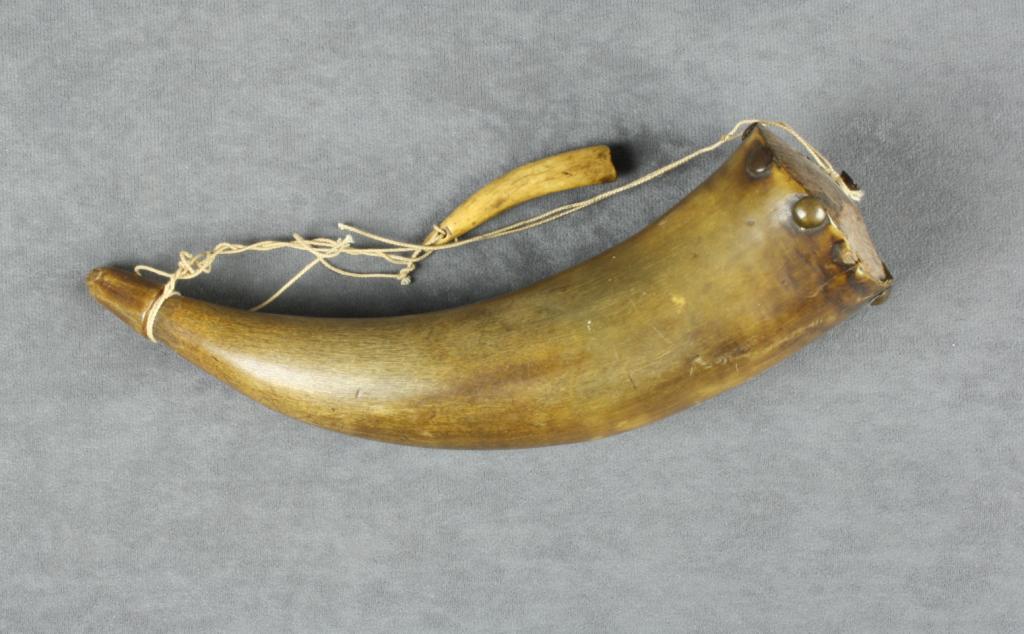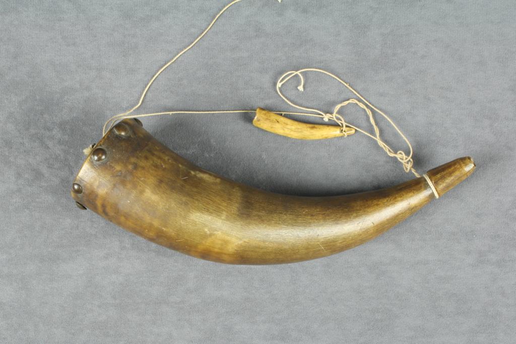 Old powder horn approx. 10” overall with wood plug and brass tacks attaching the plug; accompanied by a small priming horn; would go great with any percussion rifle. Est.: $150-$300.