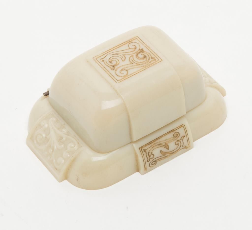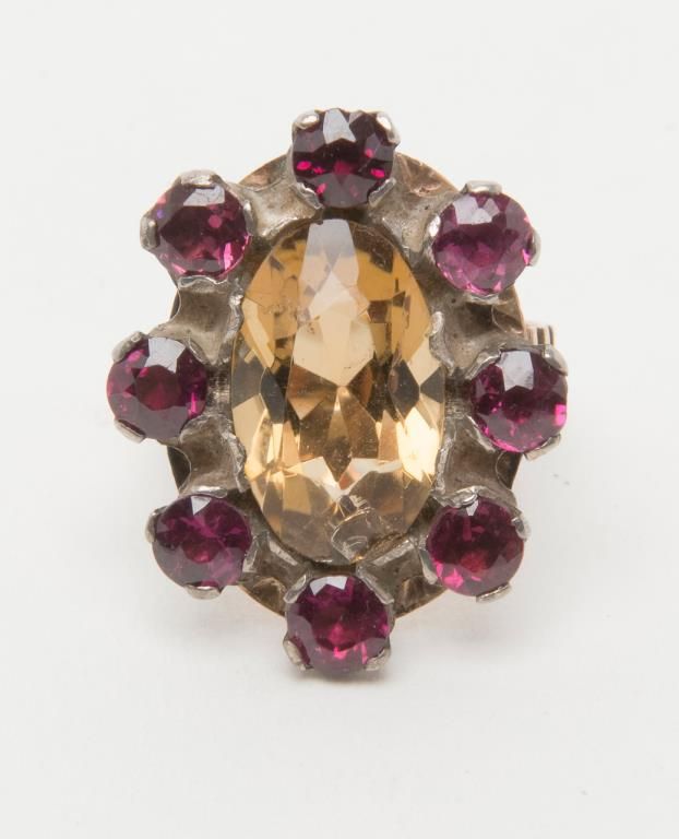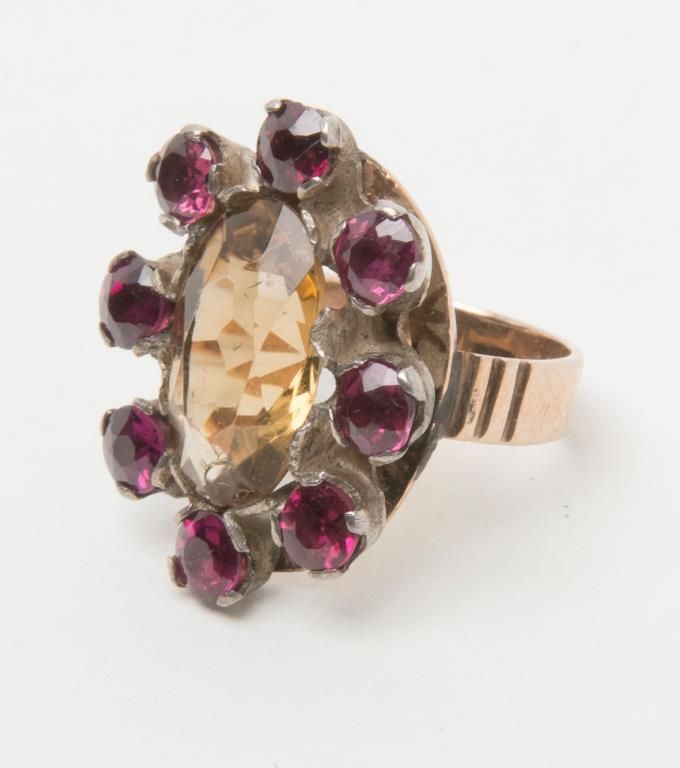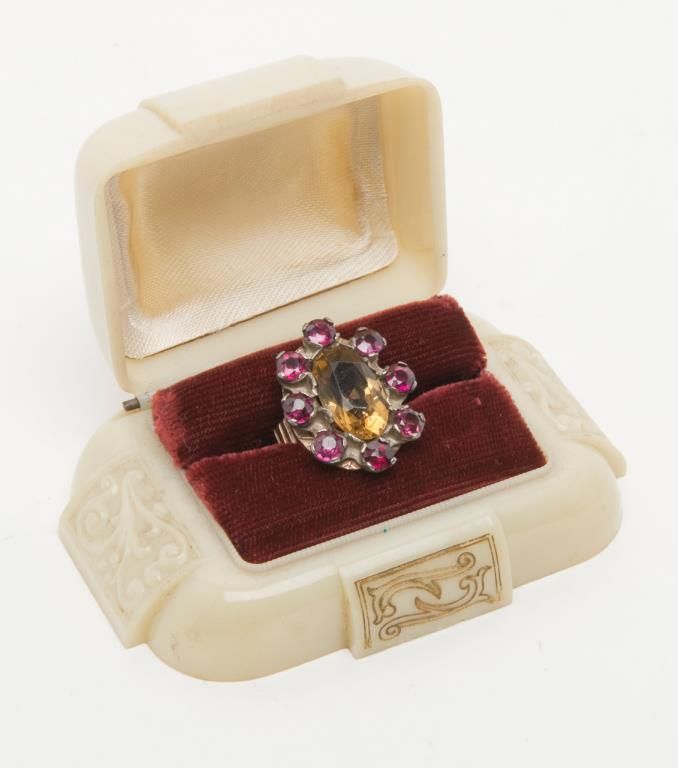 Old rose gold ladies ring with large topaz center stone with old chip at bottom, surrounded by eight cut amethysts in old white plastic padded decorative casing. Est.: $100-$150.