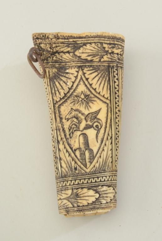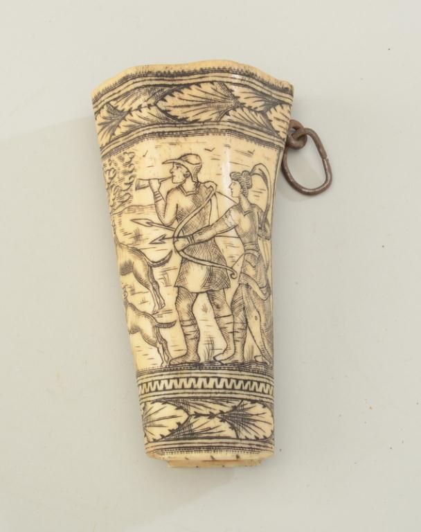 Old scrimshawed bone powder horn approx. 6-1/2” overall and approx. 3-1/2” wide tapering to approx. 2” wide; both ends open with iron hanging ring; artistry is well-accomplished with huntsmen with bow andarrow and calling horn, two dogs and a mythical winged horse; from an old estate. Est.: $150-$300.