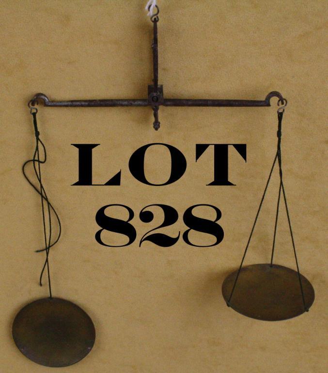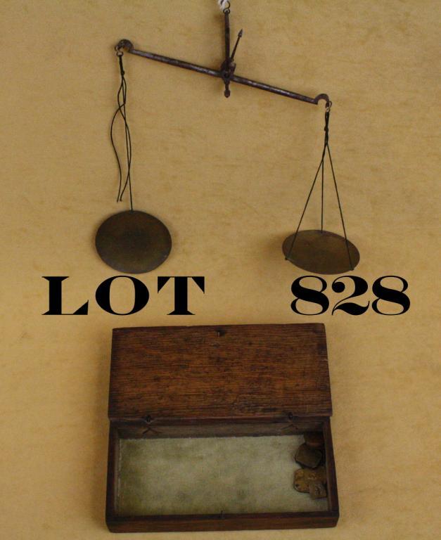 Old set of brass and iron pocket scales in hinged wood box with weights (in DWTS units); box approx. 7” x 3” x 1” in overall good condition showing some scattered erosion to the iron balance beam. Est.: $75-$150.