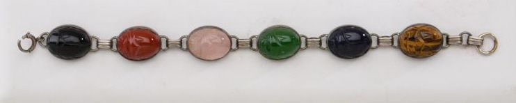 Old silver and multi-colored stone scarab bracelet with six set and carved scarabs in overall good condition; from the Bernard Braverman collection. Est.: $150-$300.