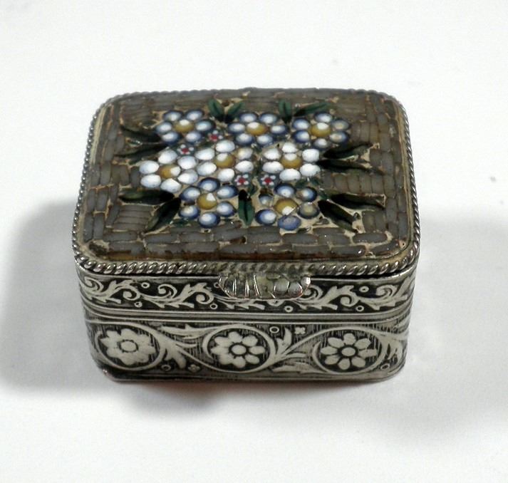 Old silver tobacco box embellished with micro-mosaic flower-shaped settings, unsigned: tested silver, weight: 24.7 gm, dimensions: 3.5X3X1.5 cm.