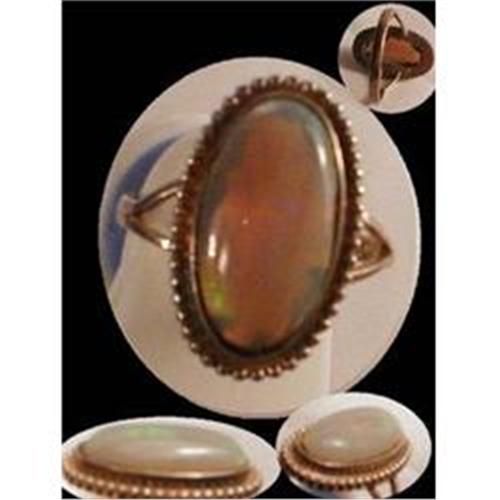 I don?t know much about opal but this one is really unusual. You can see the colors when you hold it an any angle in the light so the photos didn?t really pick them up . The color is a milky gray and the setting is 7/8" long. The ring is a size 8 and is marked sterling with a double arrow hallmark on the inside. The back needs some cleaning but it is in great shape other than that. Sold as is.